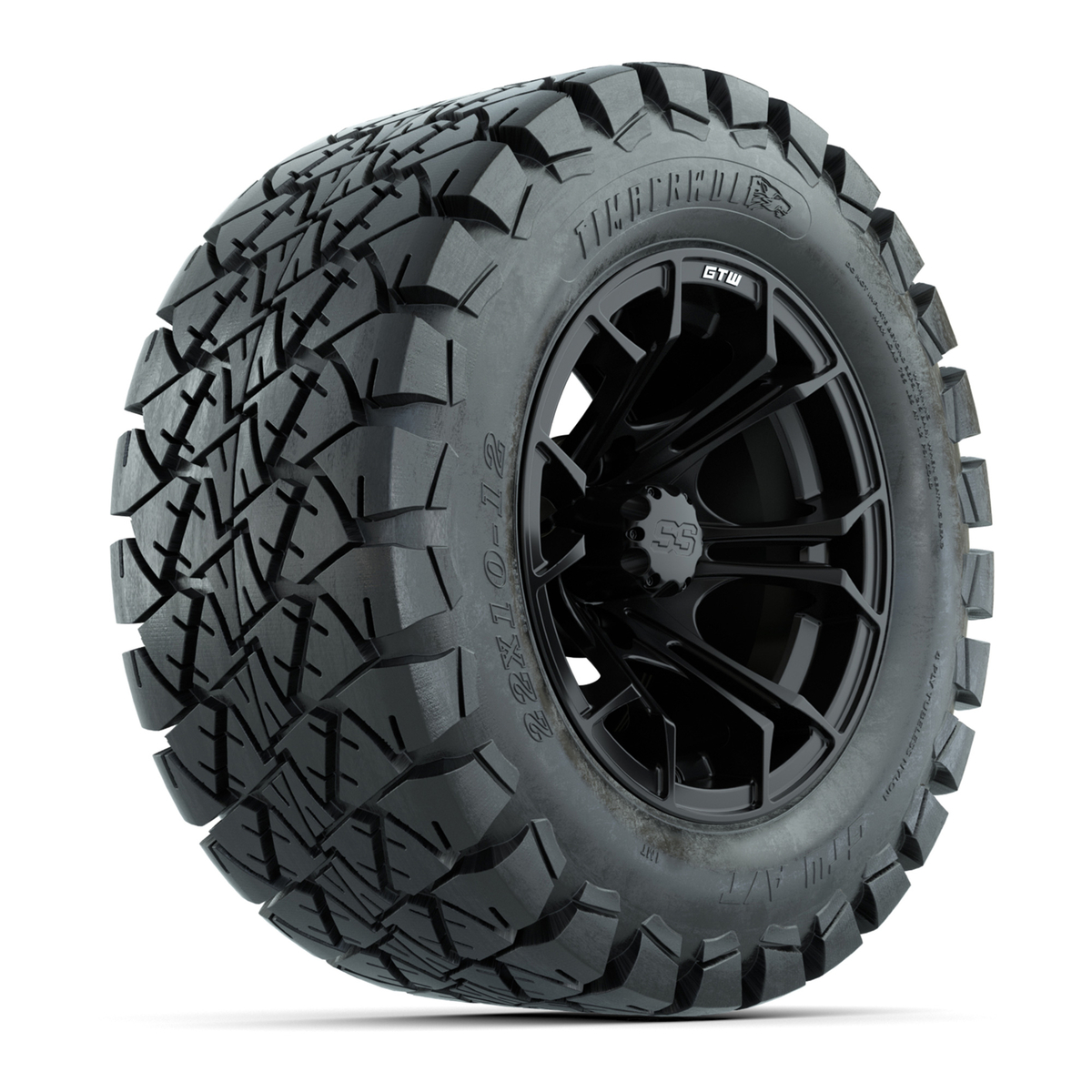 A set of (4) 12-inch Spyder matte black lifted golf cart wheels on 22-inch trail tires
