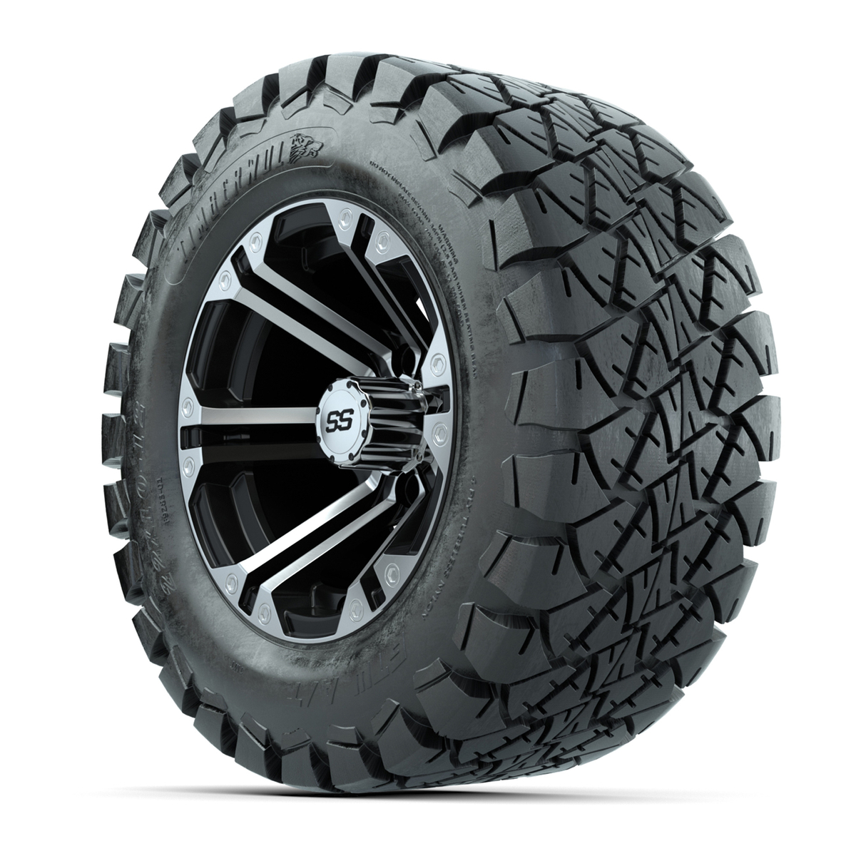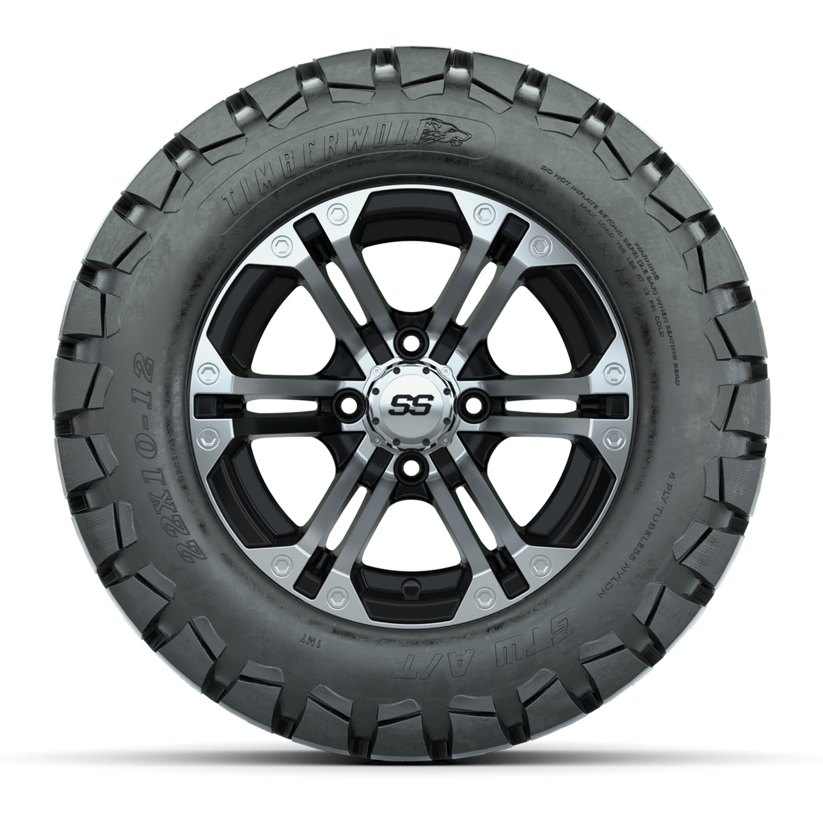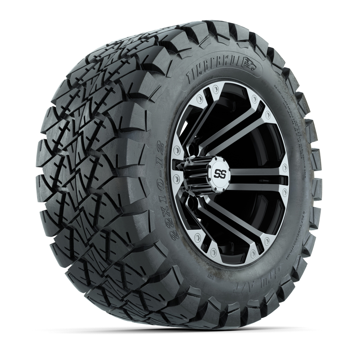 A set of (4) 12-inch Specter black/machined lifted golf cart wheels on 22-inch trail tires