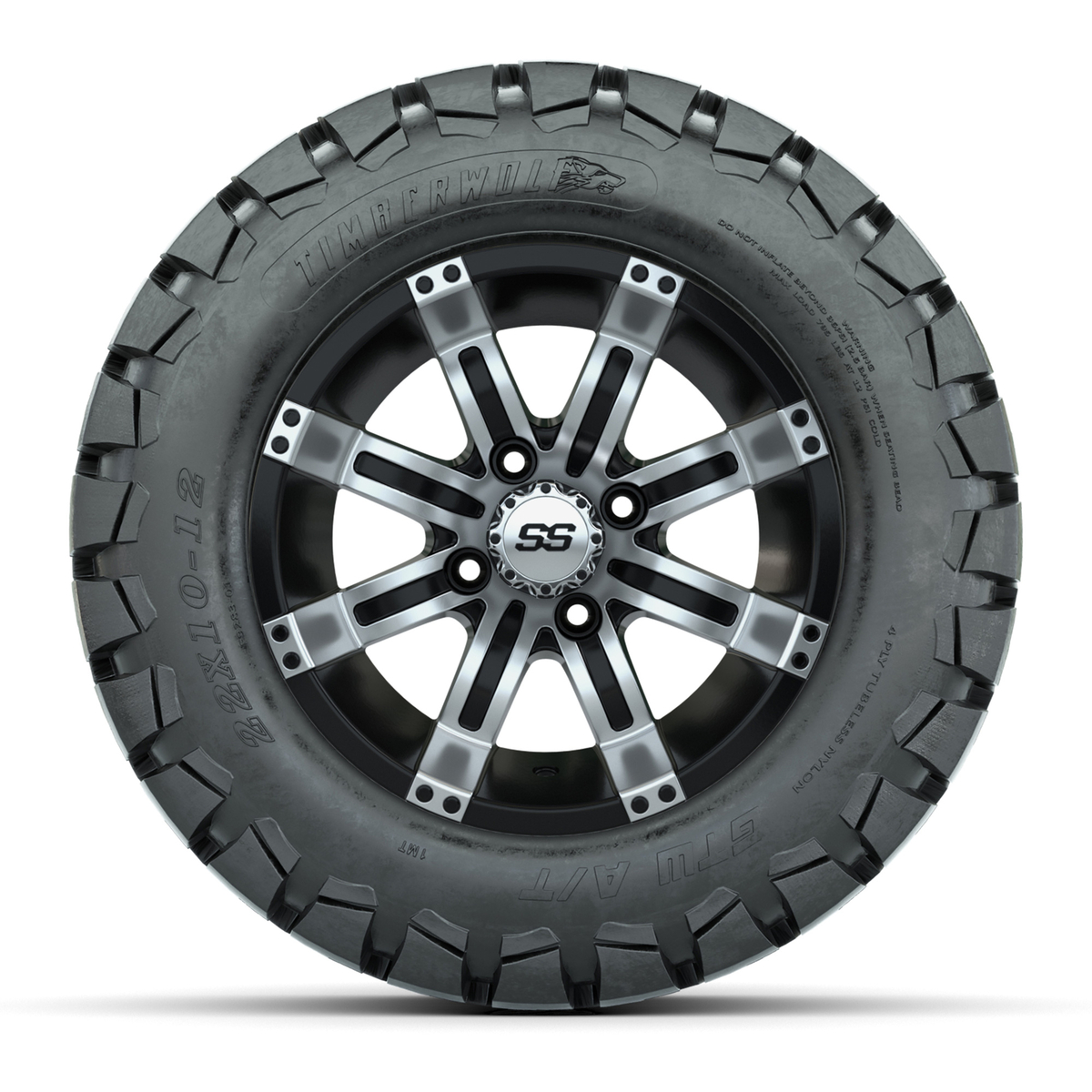 A set of (4) 12-inch Tempest black/machined lifted golf cart wheels on 22-inch trail tires