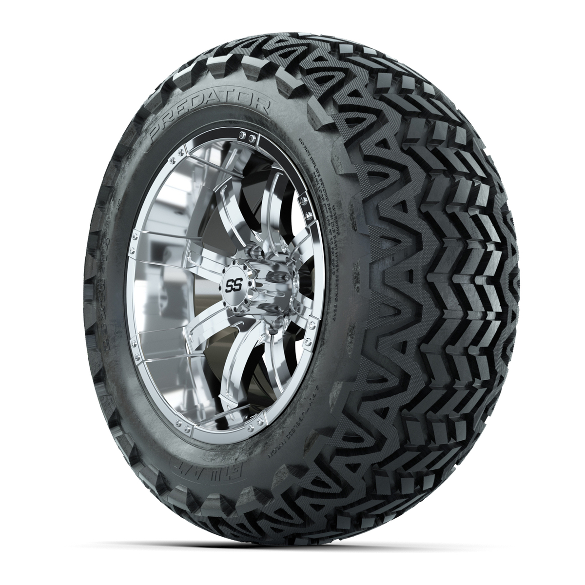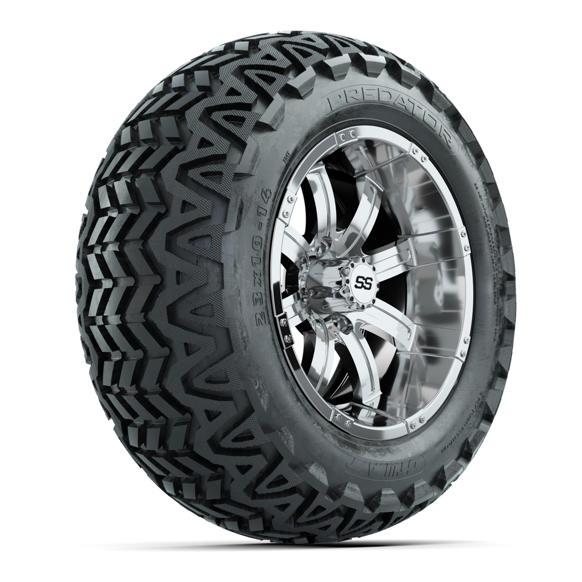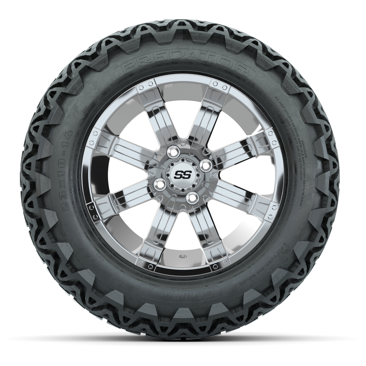 A set of (4) 14-inch Tempest chrome finish lifted golf cart wheels on 23-inch A/T tires