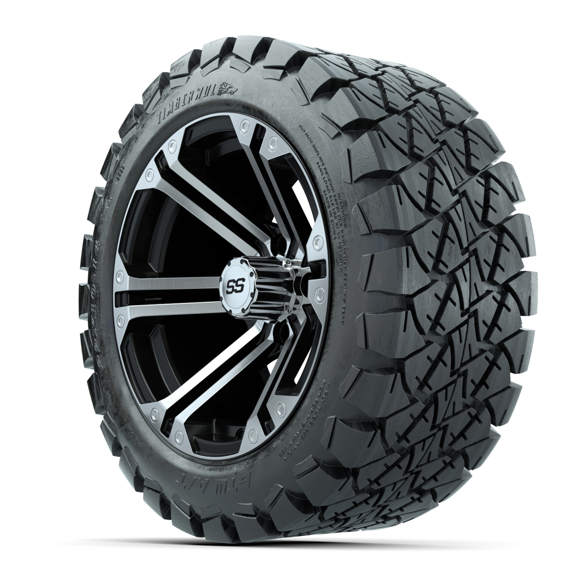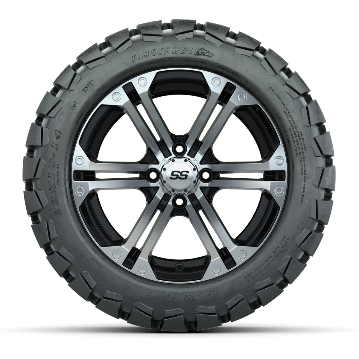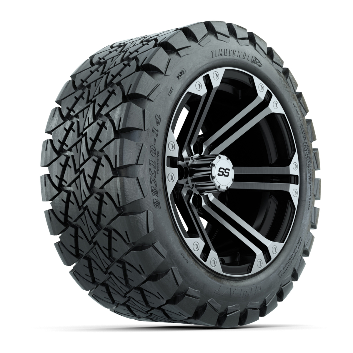 A set of (4) 14-inch Specter black/machined lifted golf cart wheels on 22-inch trail tires