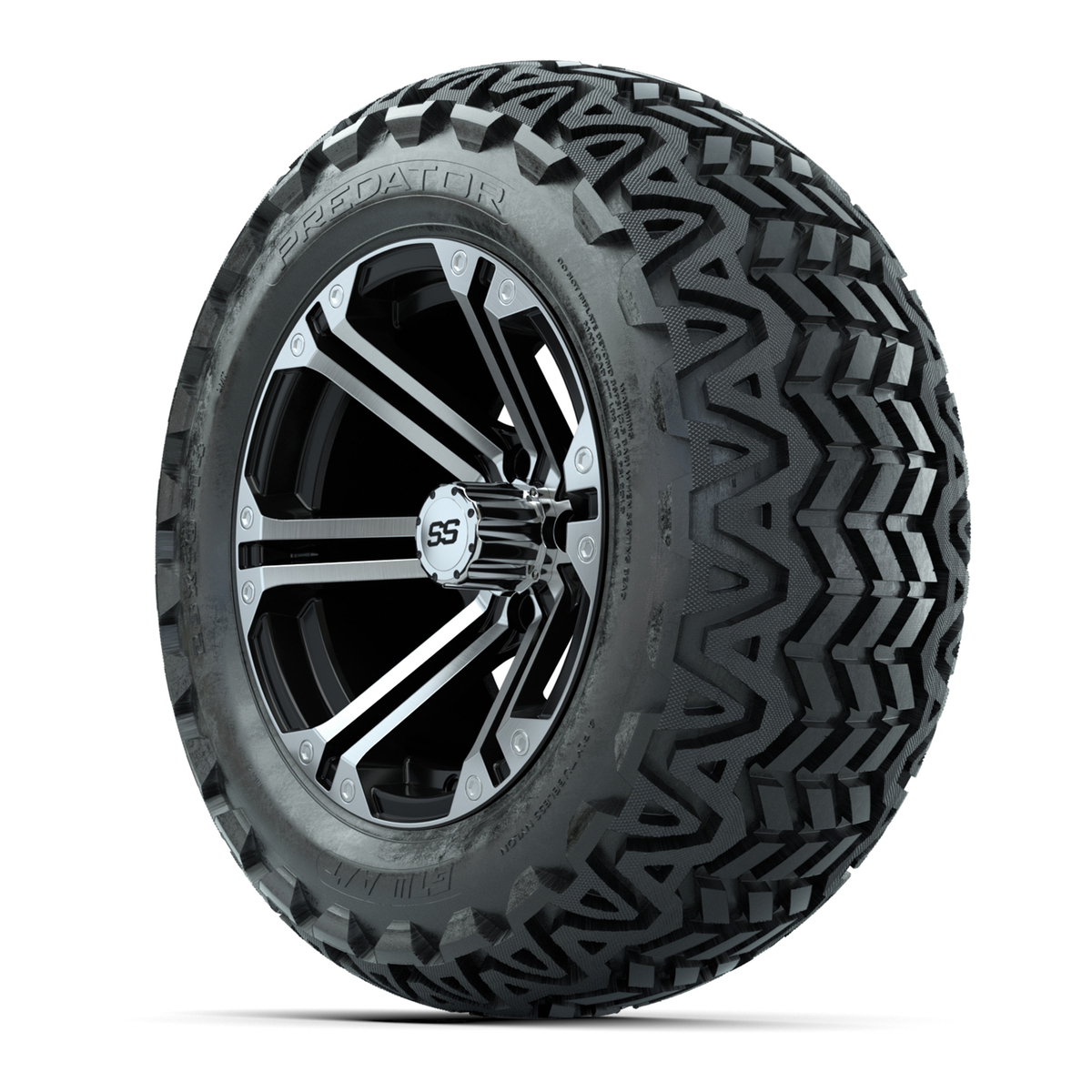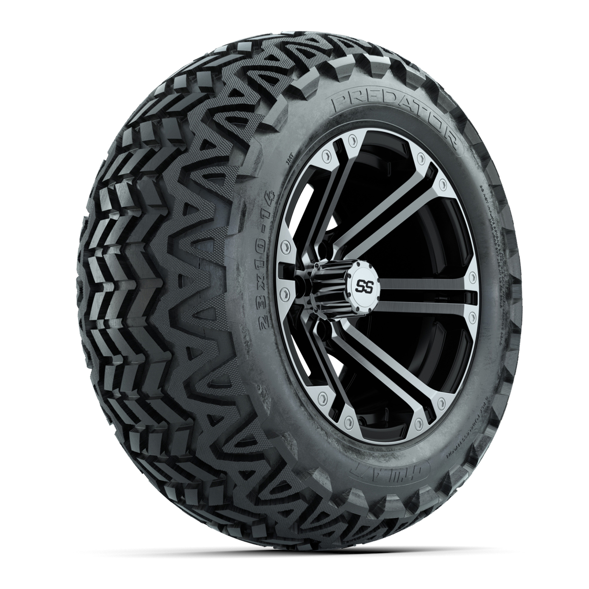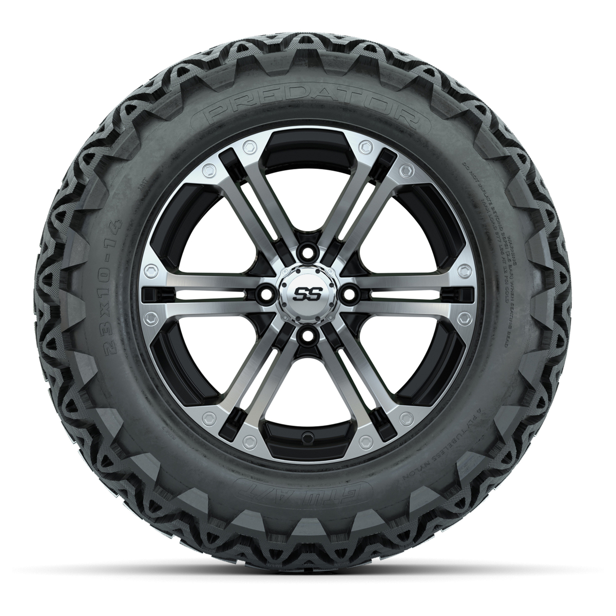 A set of (4) 14-inch Specter black/machined lifted golf cart wheels on 23-inch A/T tires