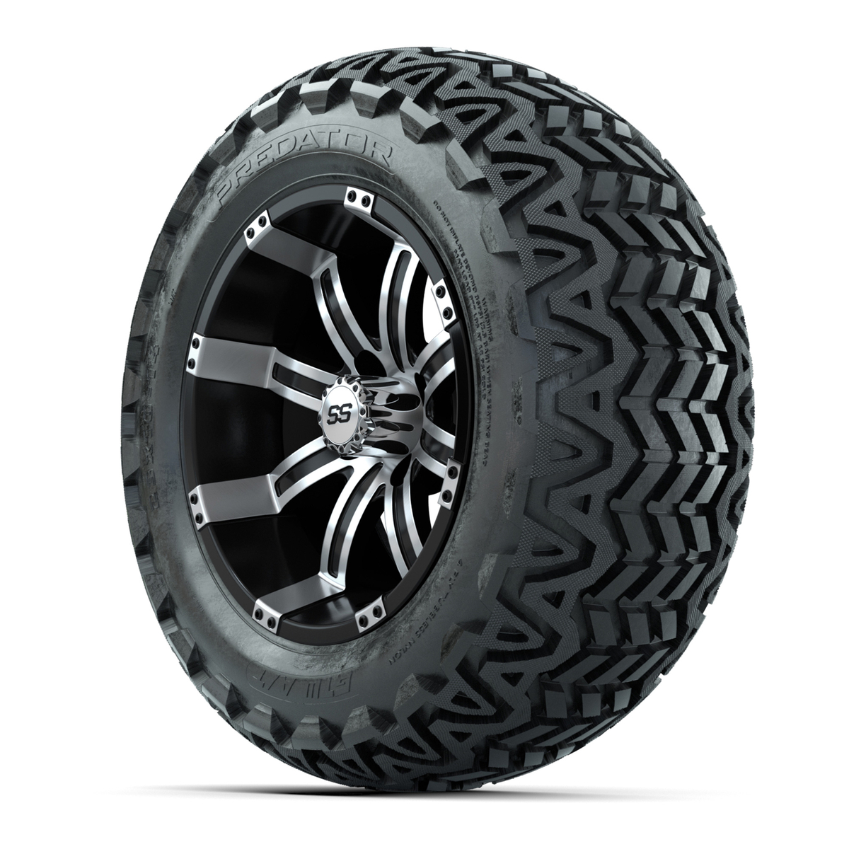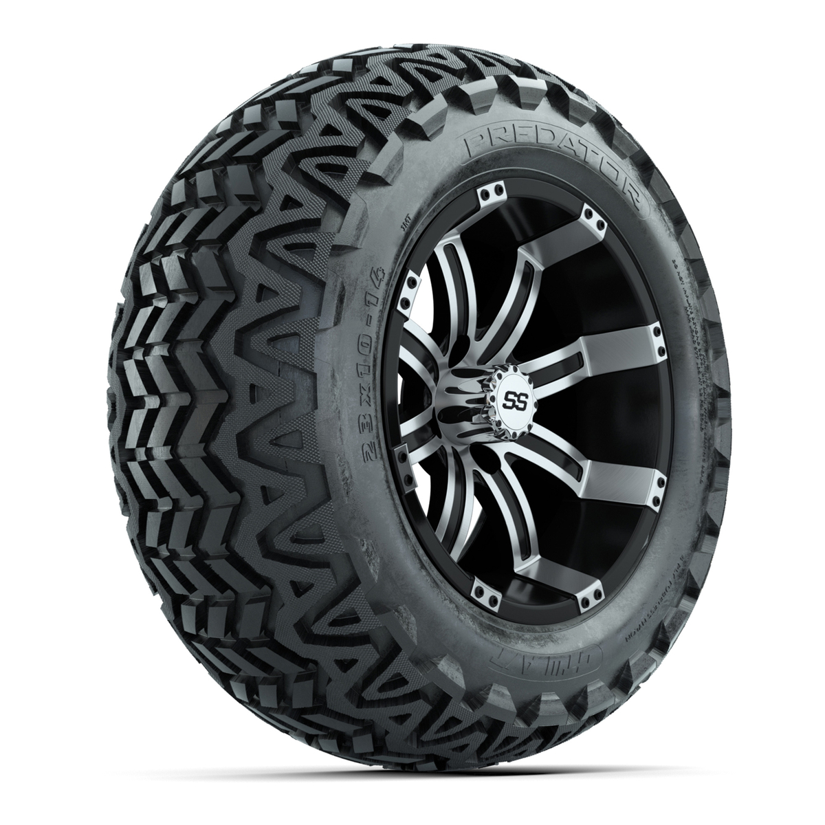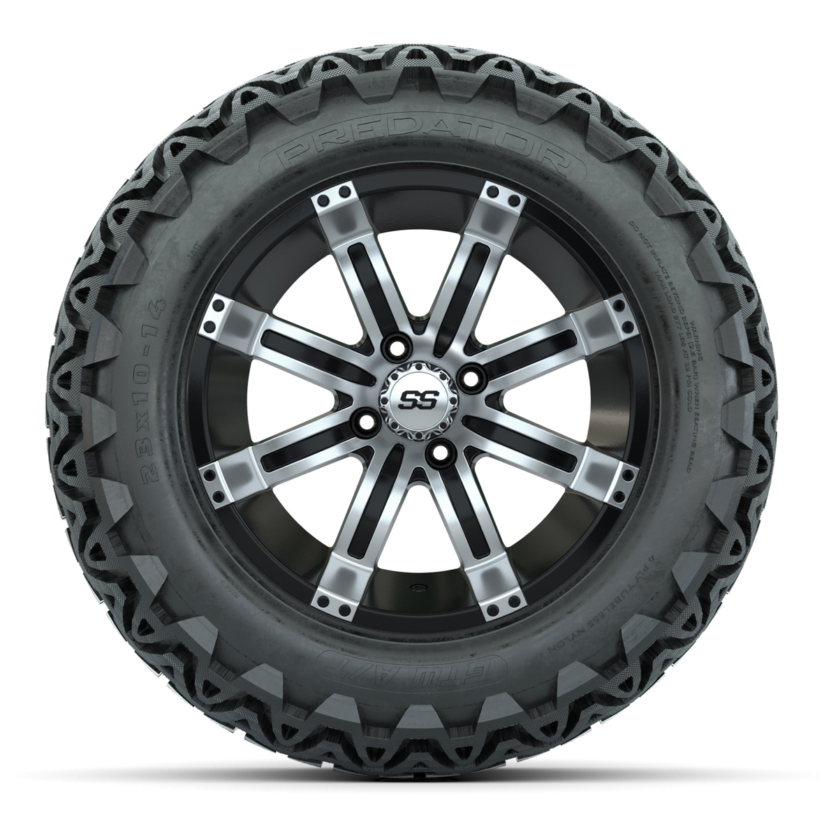 A set of (4) 14-inch Tempest Black/Machined lifted golf cart wheels on 23-inch A/T tires