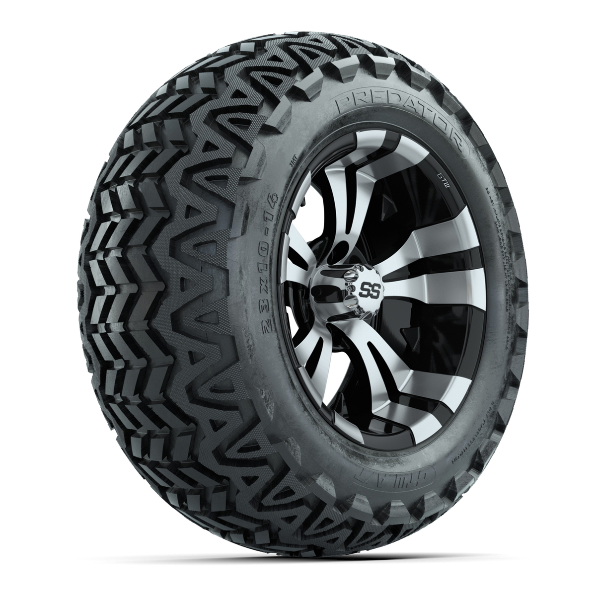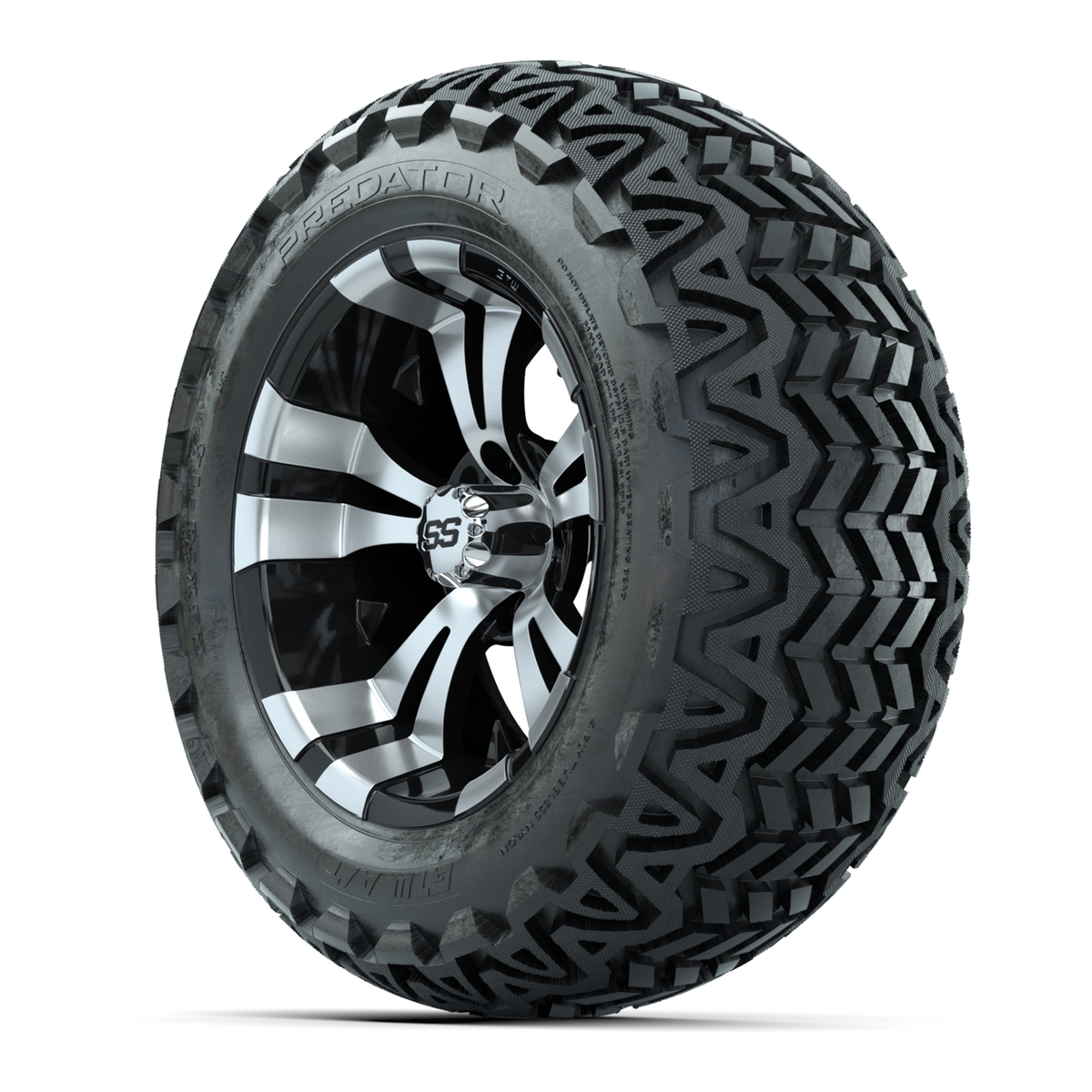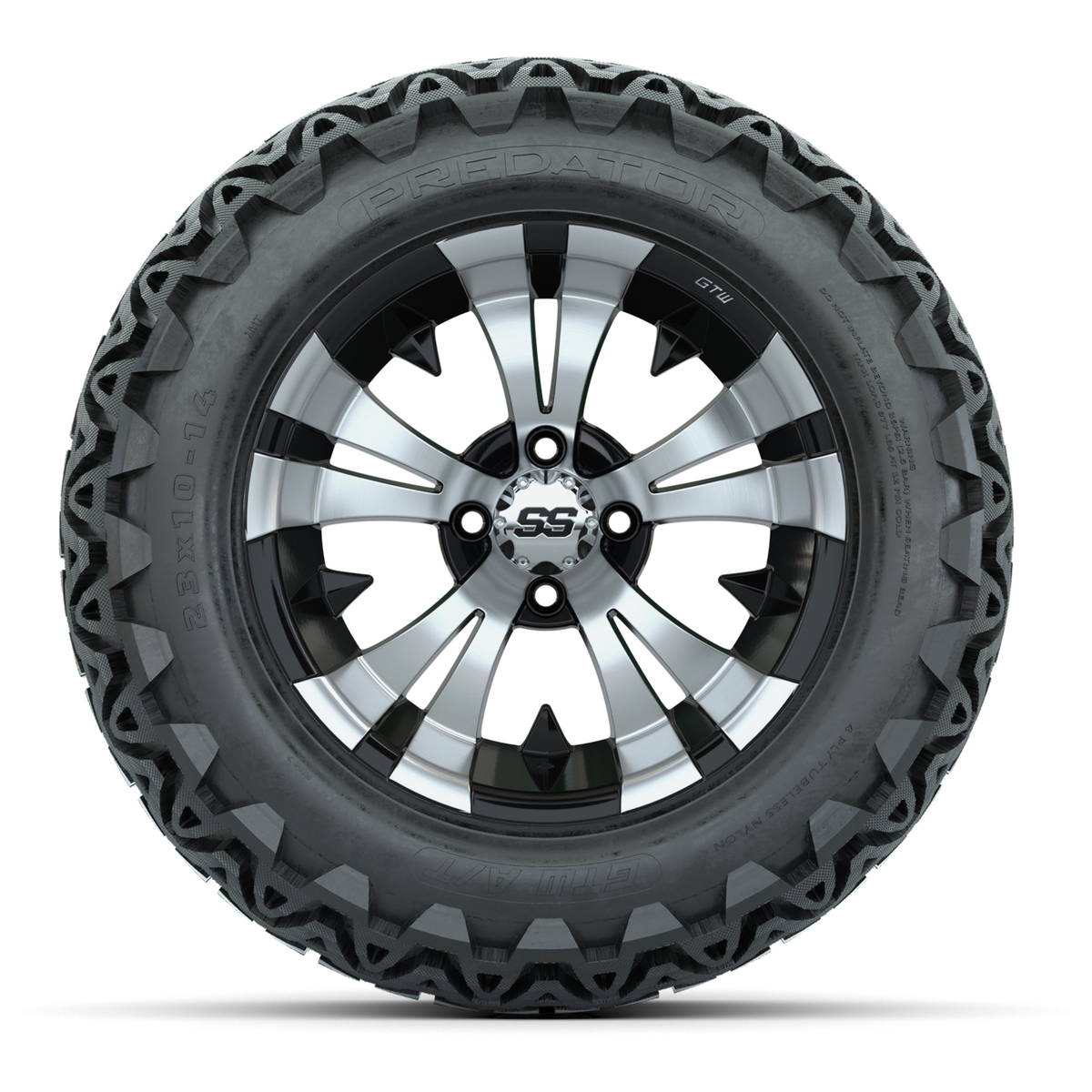 A set of (4) 14-inch Vampire Black/Machined lifted golf cart wheels on 23-inch A/T tires