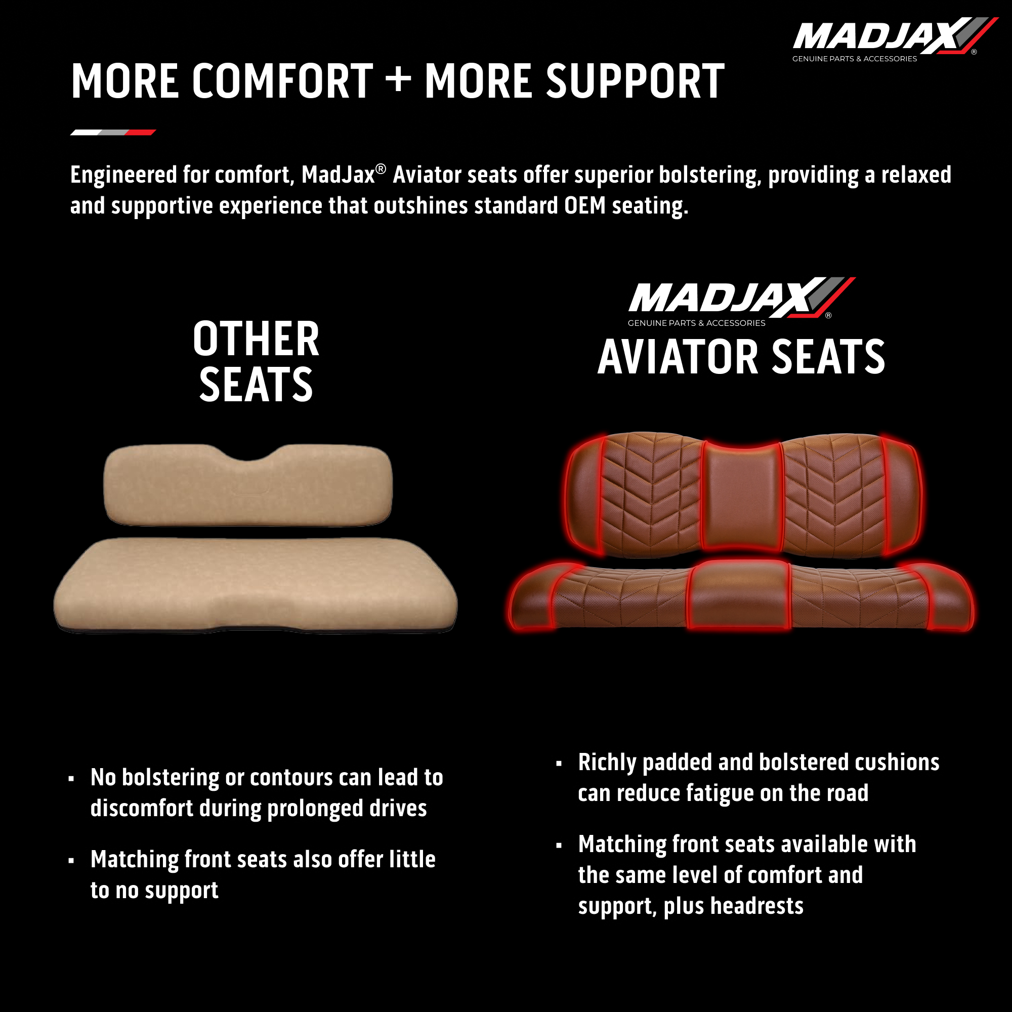 Turn heads with the MadJax® Aviator rear seat cushions, crafted from marine-grade vinyl for lasting performance and a luxurious feel. With elegant hand-stitched details and a distinctive design, these seats not only enhance your cart’s appearance but provide exceptional comfort for every ride.