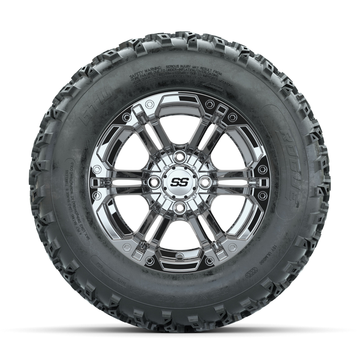A set of (4) 12-inch GTW® Specter Chrome golf cart wheels Mounted on 23x10.00-12 Rogue All-Terrain Tires