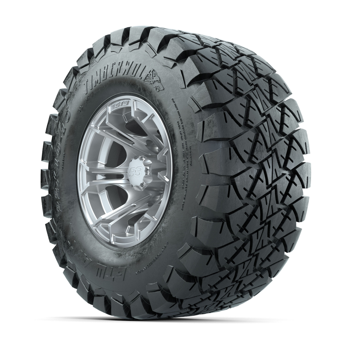 A set of (4) 10-inch GTW® Spyder Silver Brush golf cart wheels Mounted on 22x10-10 GTW Timberwolf All-Terrain Tires