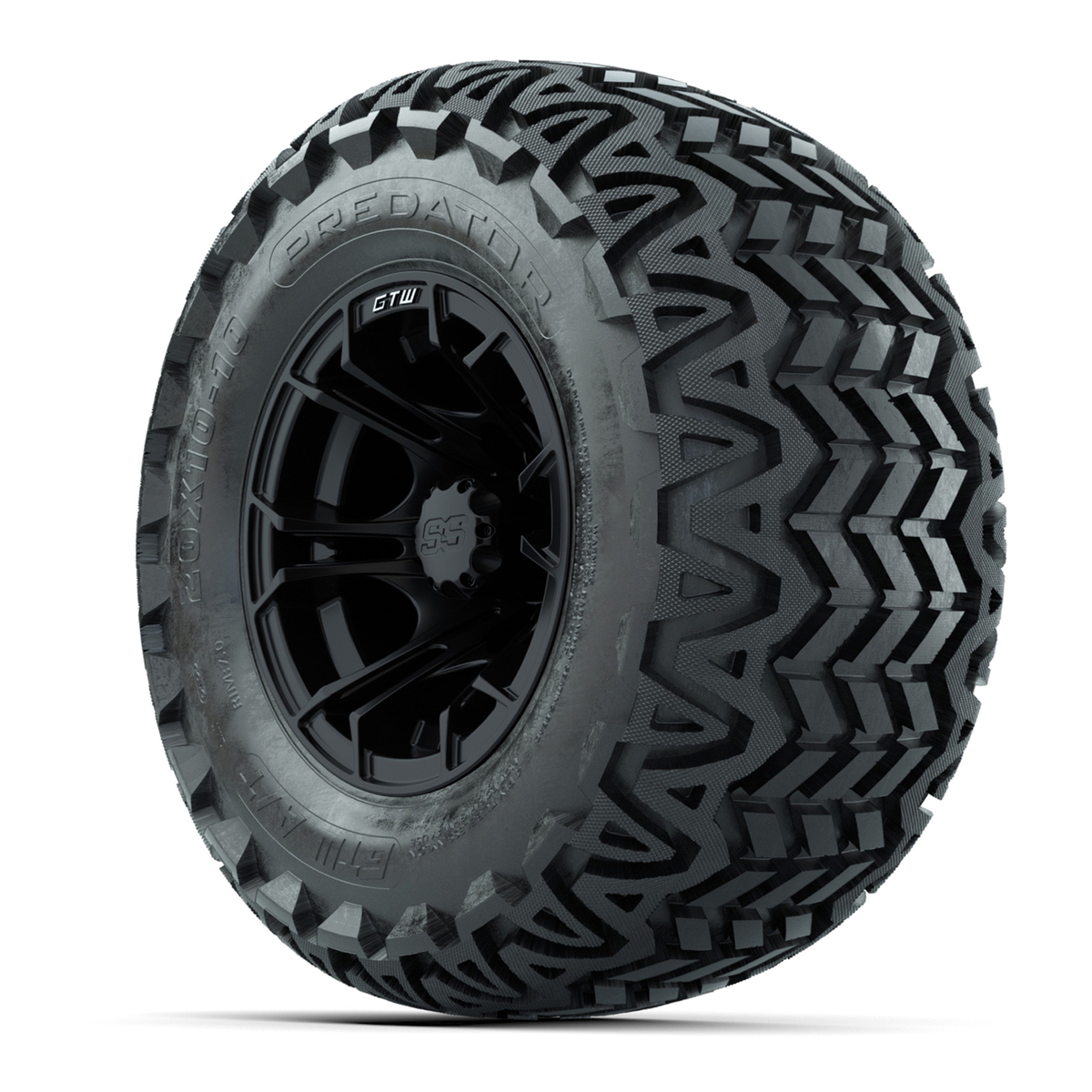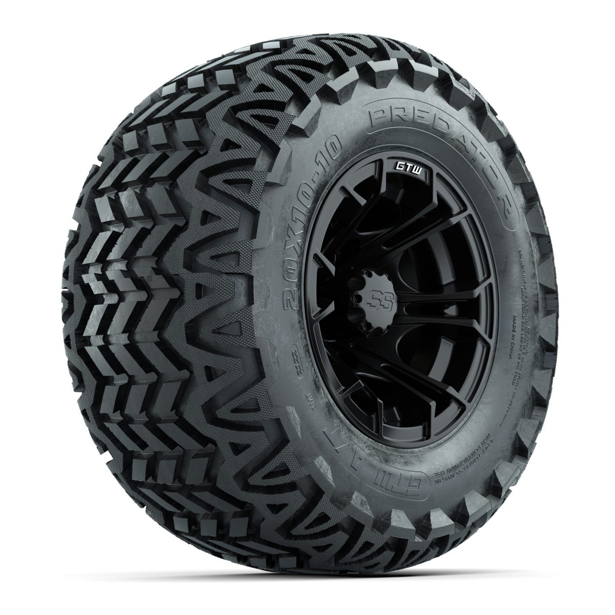 A set of (4) 10-inch GTW® Spyder Matte Black golf cart wheels Mounted on 20x10-10 Predator All-Terrain Tires