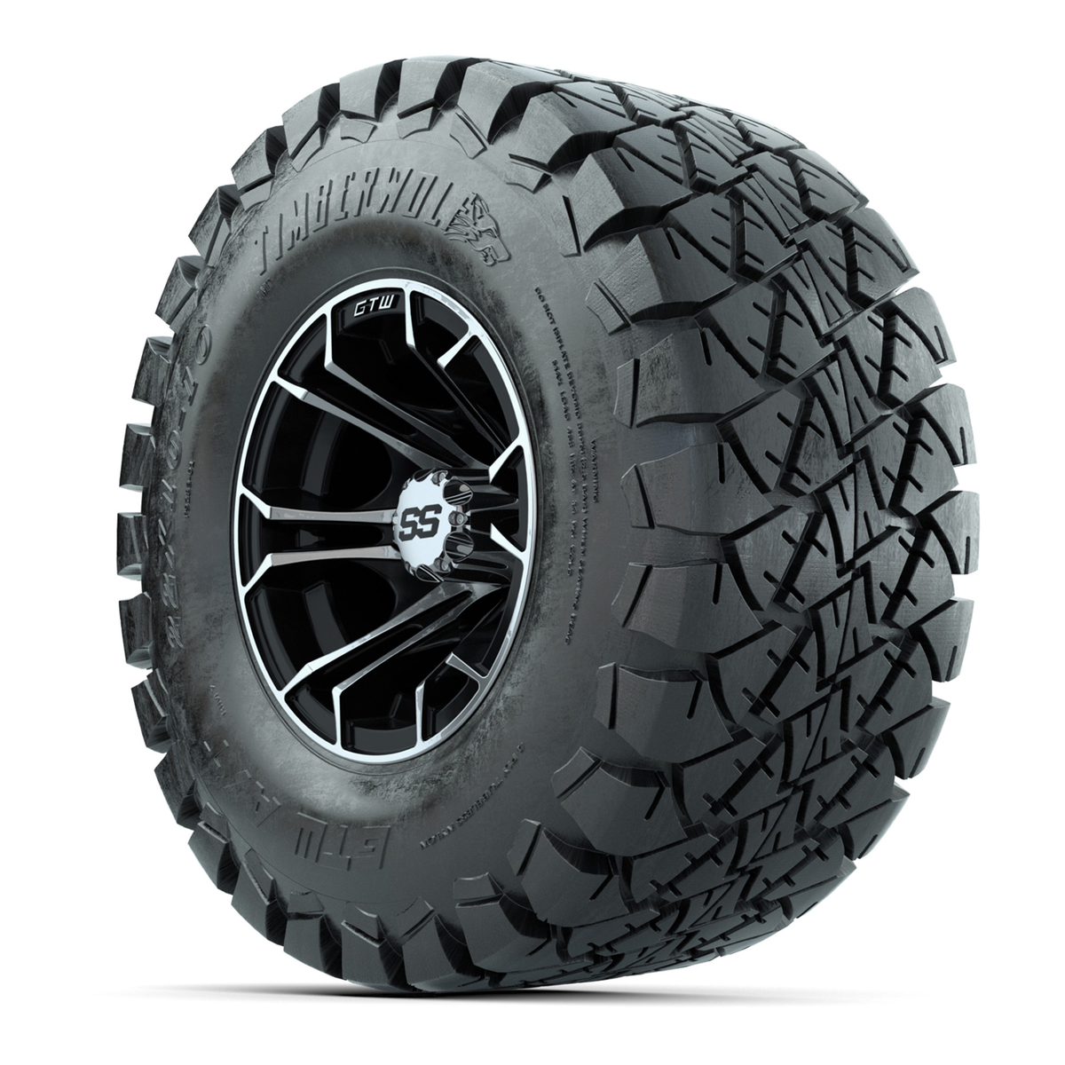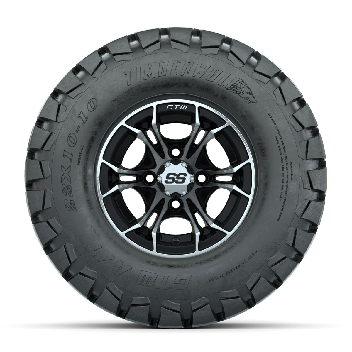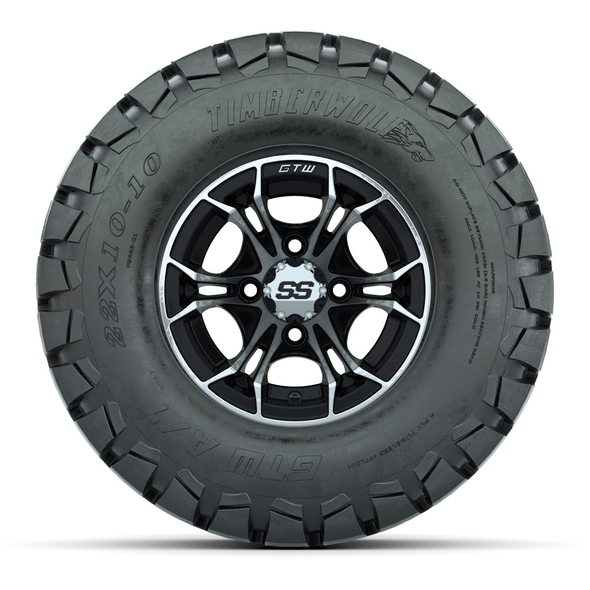 A set of (4) 10-inch GTW® Spyder Machined/Black golf cart wheels Mounted on 22x10-10 GTW Timberwolf All-Terrain Tires