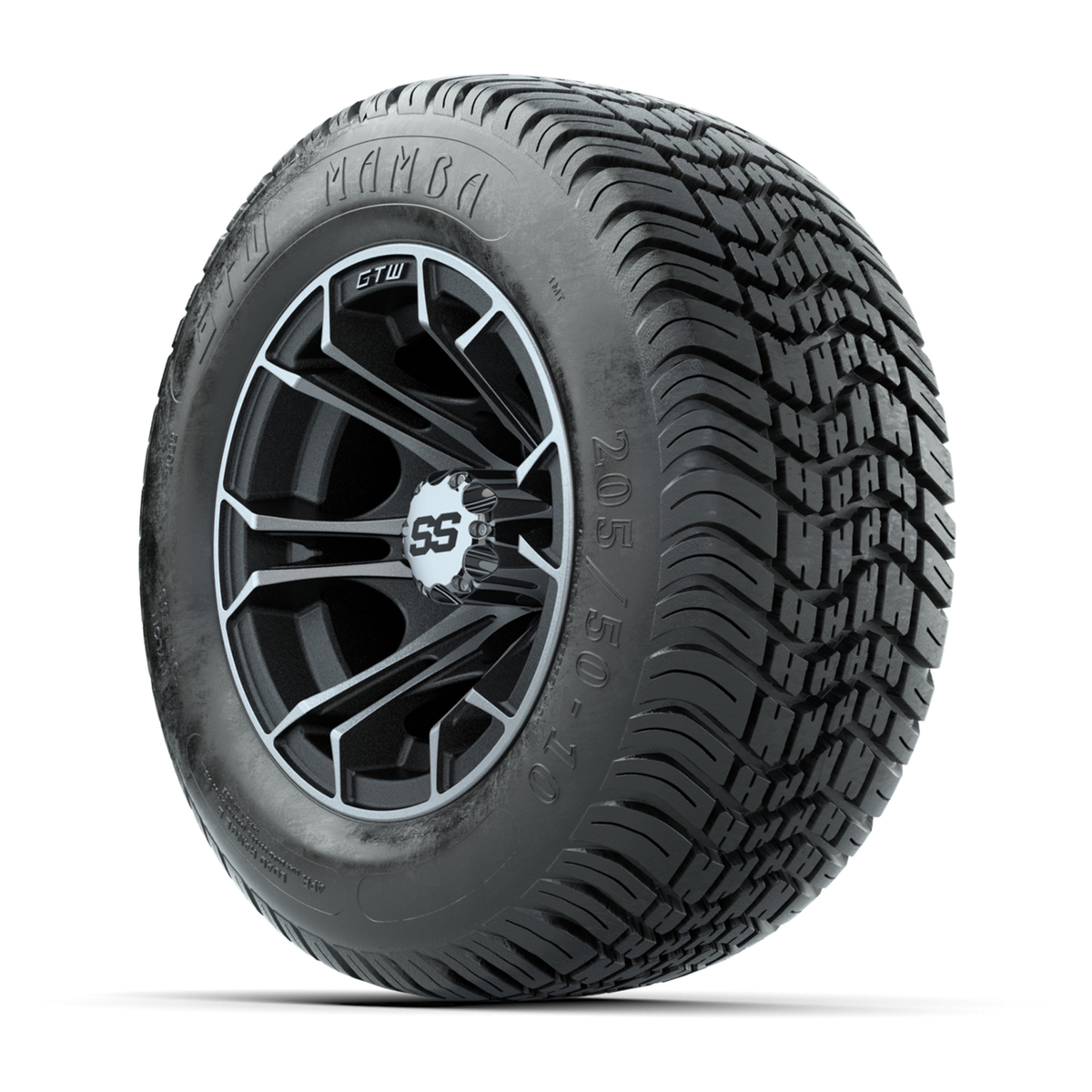 A set of (4) 10-inch GTW® Spyder Machined/Matte Grey golf cart wheels Mounted on 205/50-10 Mamba Street Tires
