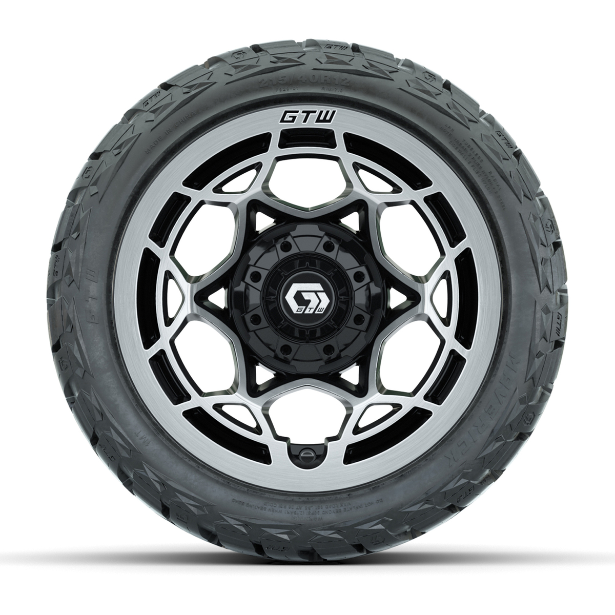 A set of (4) 12-inch GTW® Nexus Gloss Black/Silver golf cart wheels Mounted on 215/40-R12 Maverick Low-Profile All-Terrain Tires