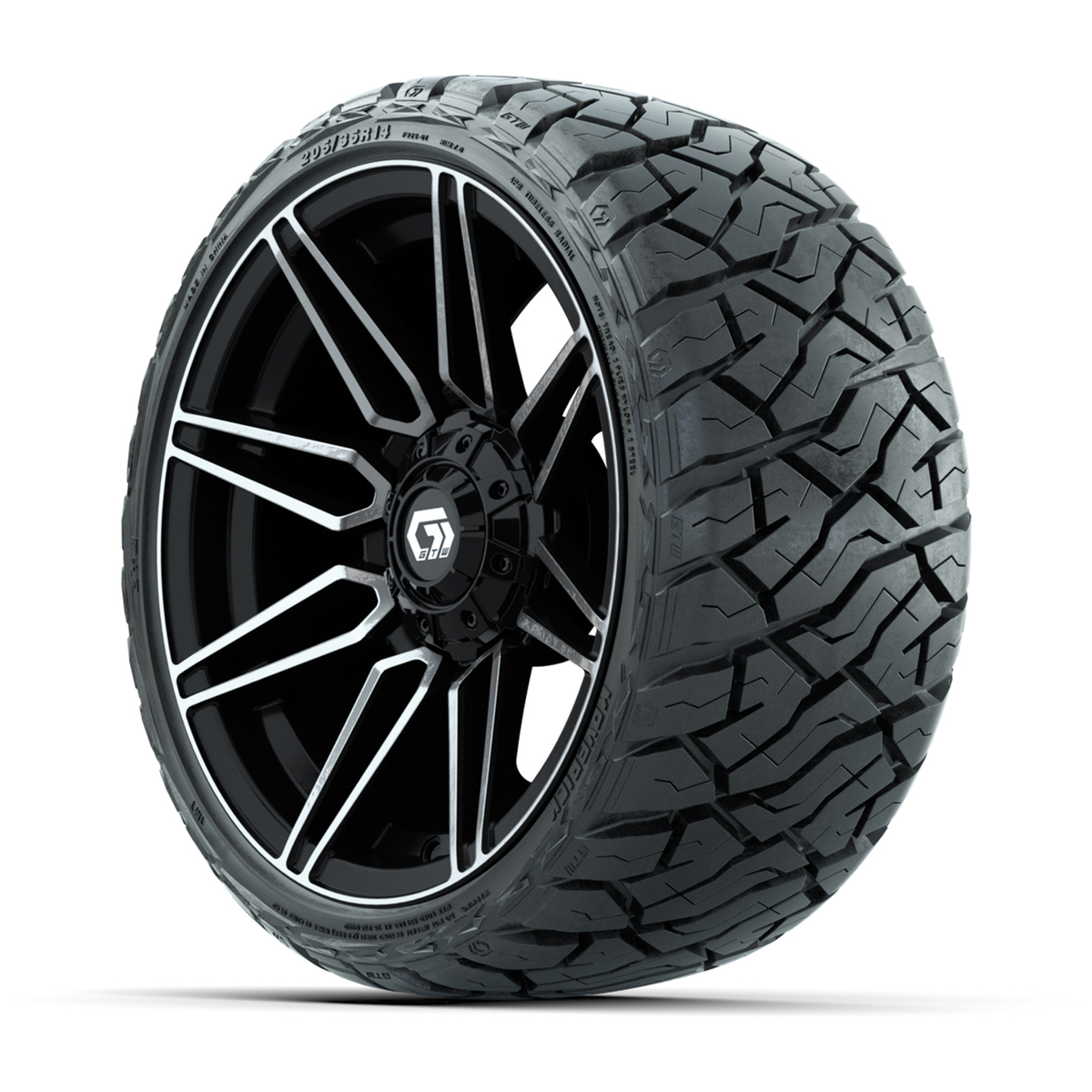A set of (4) 14-inch GTW® Stealth Gloss Black & Machined golf cart wheels Mounted on 205/35-R14 Maverick Low-Profile All-Terrain Tires