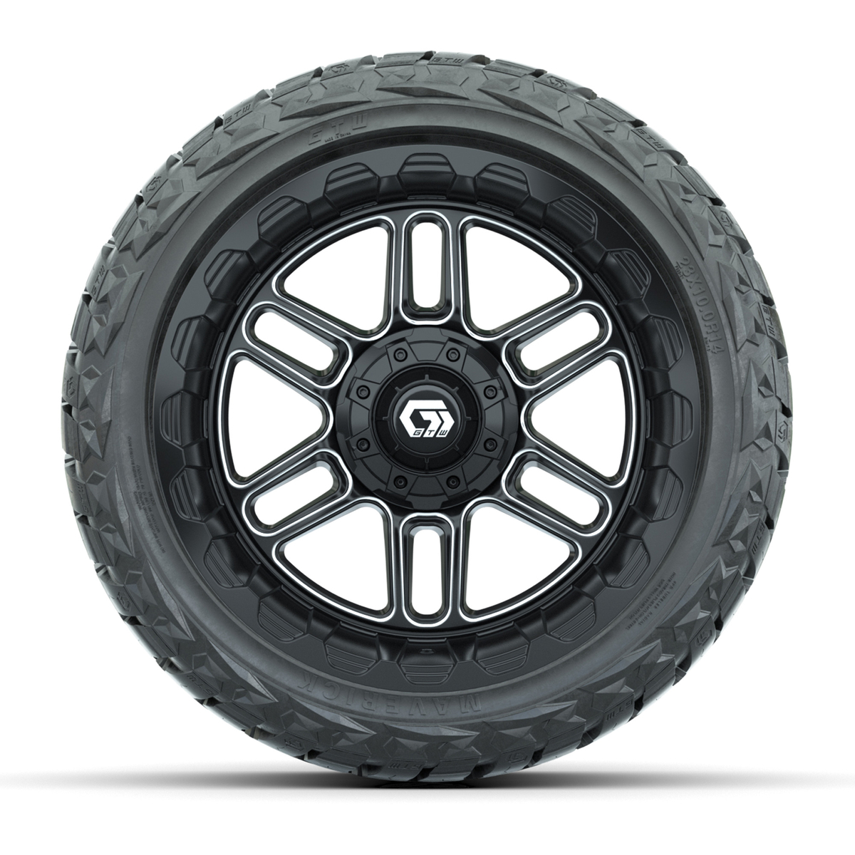 A set of (4) 14-inch GTW® Titan Black/Machined golf cart wheels Mounted on 23x10.00-R14 Maverick All-Terrain Tires