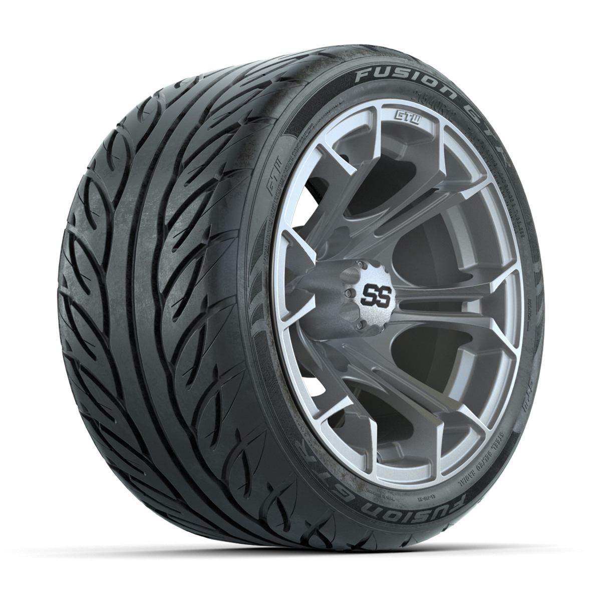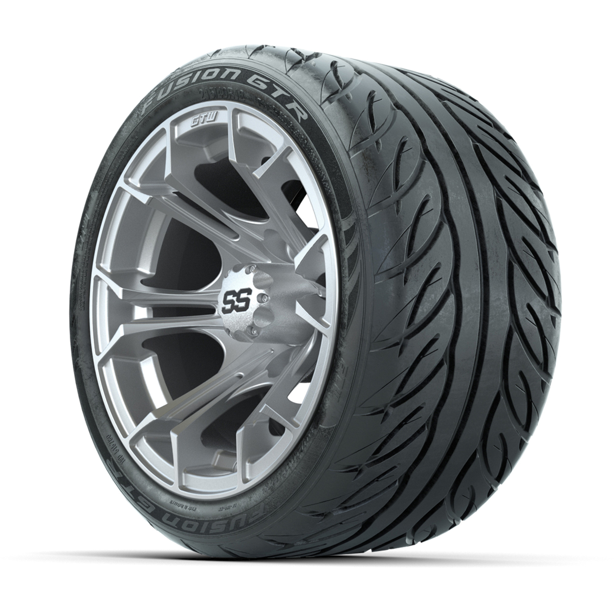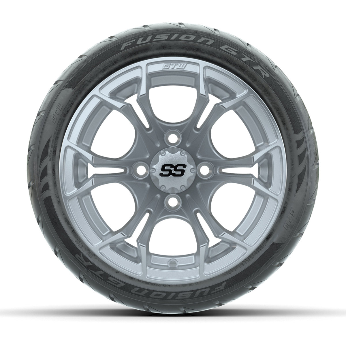A set of (4) 12-inch GTW® Specter Silver Brush golf cart wheels mounted on 215/40-R12 Fusion GTR Steel Belt Radial Street Tires
