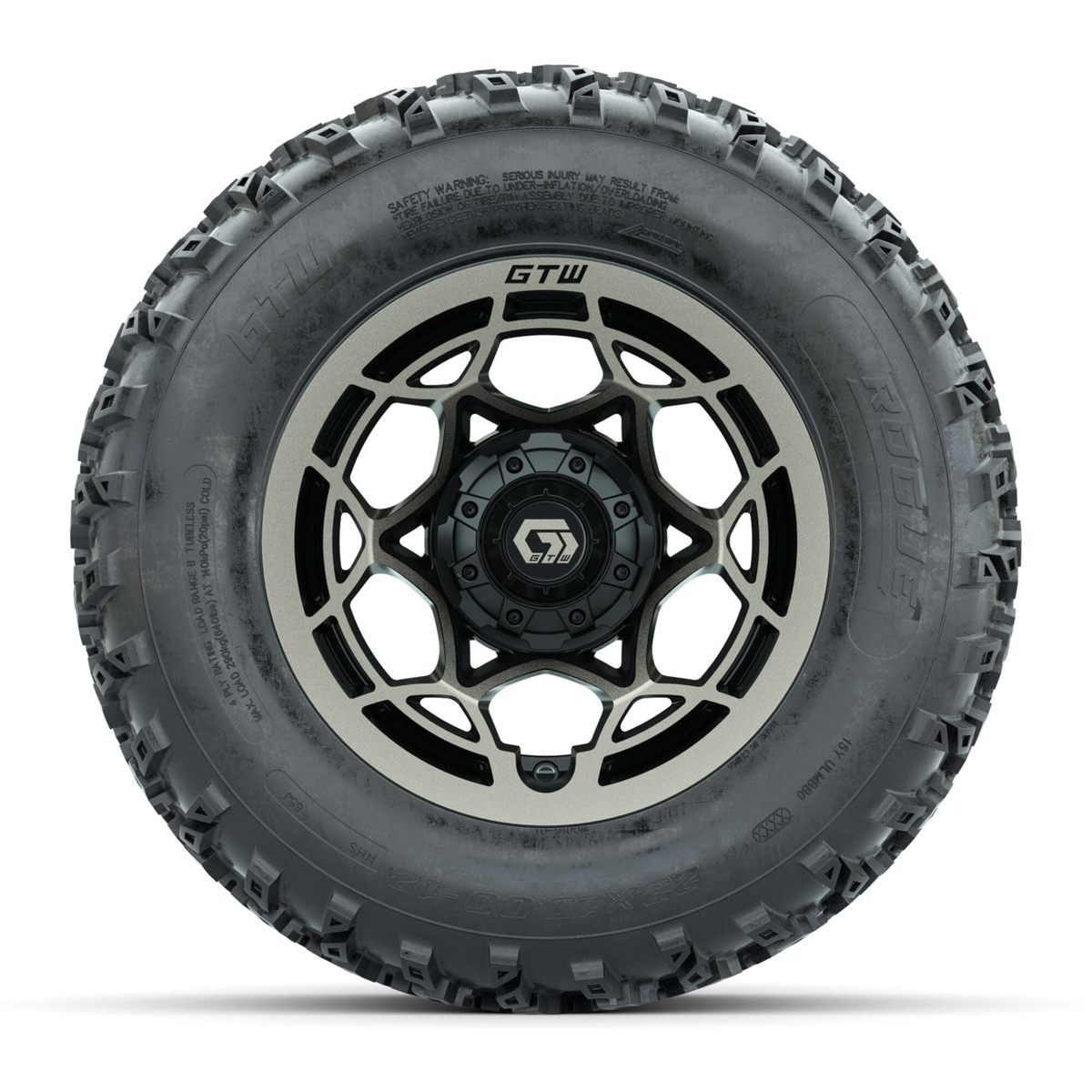A set of (4) 12-inch GTW® Nexus Black/Bronze golf cart wheels mounted on 23x10-12 GTW® Rogue all-terrain tires
