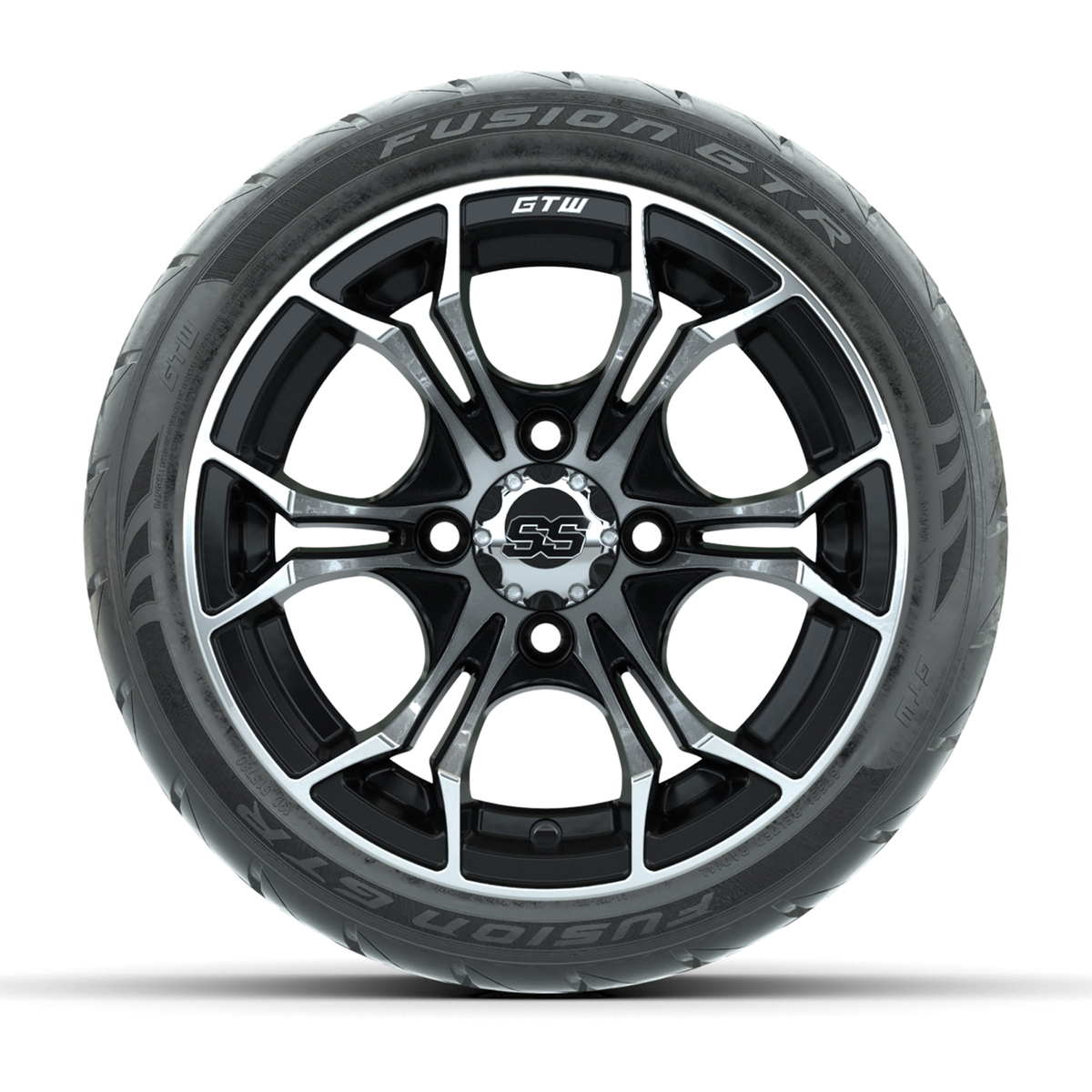 A set of (4) 12-inch GTW® Spyder Black/Machined golf cart wheels mounted on 215/40-R12 Fusion GTR Steel Belt Radial Street Tires