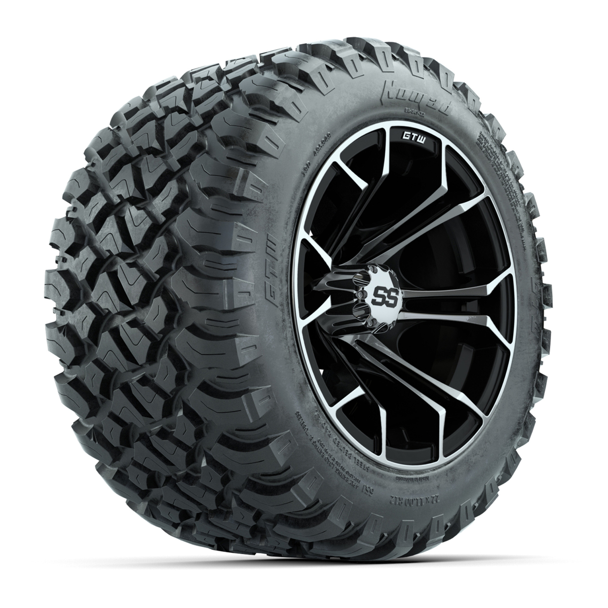A set of (4) 12-inch GTW® Spyder Black/Machined golf cart wheels mounted on 22X11-R12 GTW® Nomad Steel Belt Radial All-Terrain Tires