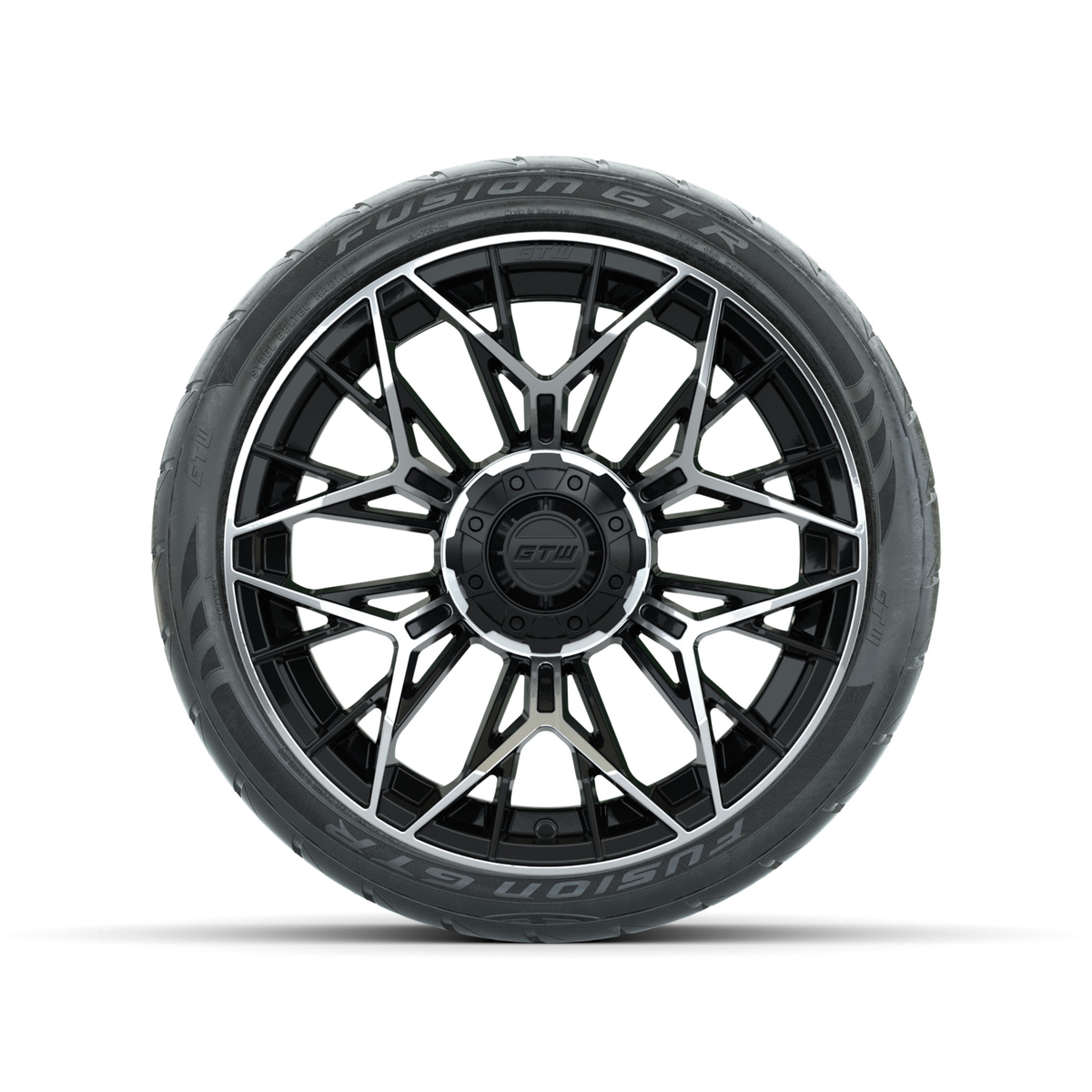 A set of (4) 15-inch GTW® Stellar machined face with black golf cart wheels on 215/40-R15 GTW® Fusion GTR Steel Belted Street Tires