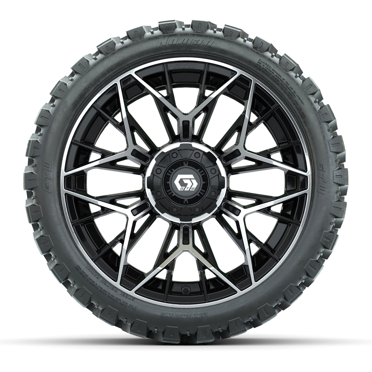 A set of (4) 15-inch GTW® Stellar machined face with black golf cart wheels on 23x10-R15 GTW® Nomad Steel Belted Radial All-Terrain Tires