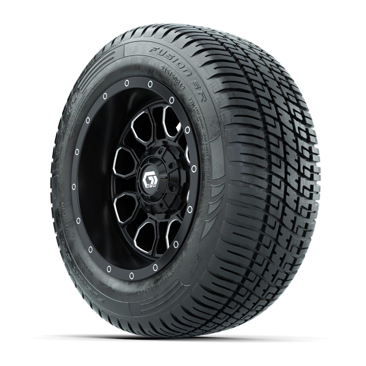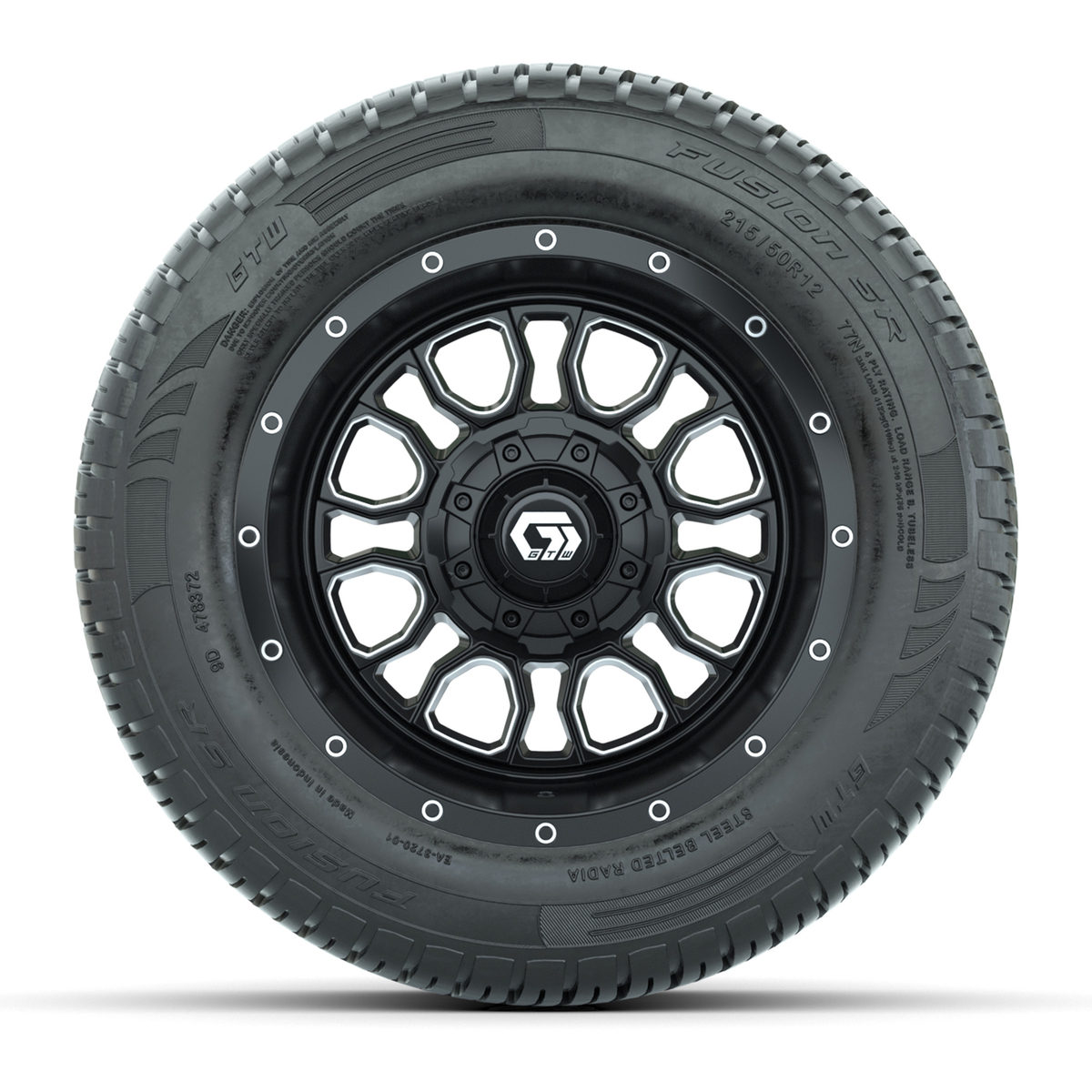 A set of (4) 12-inch GTW® Volt machined face with black golf cart wheels on 215/50-R12 GTW® Fusion S/R Steel Belted Street Tires