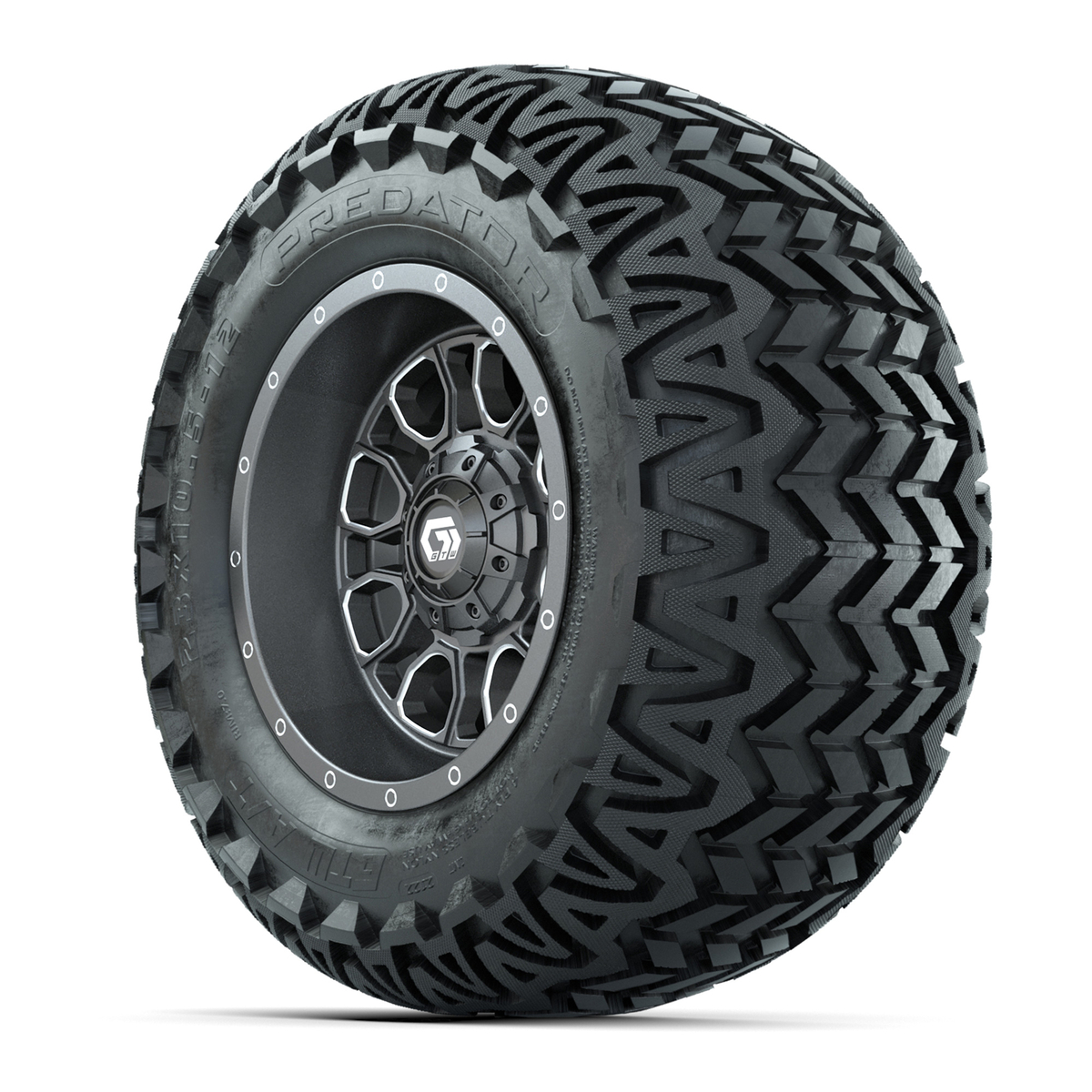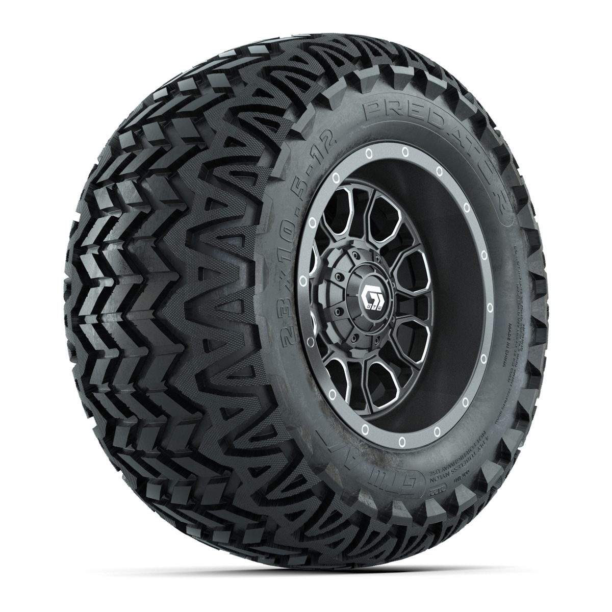 A set of (4) 12-inch GTW® Volt Gunmetal with Machined Accents golf cart wheels on 23x10.5-12 GTW® Predator All-Terrain Tires