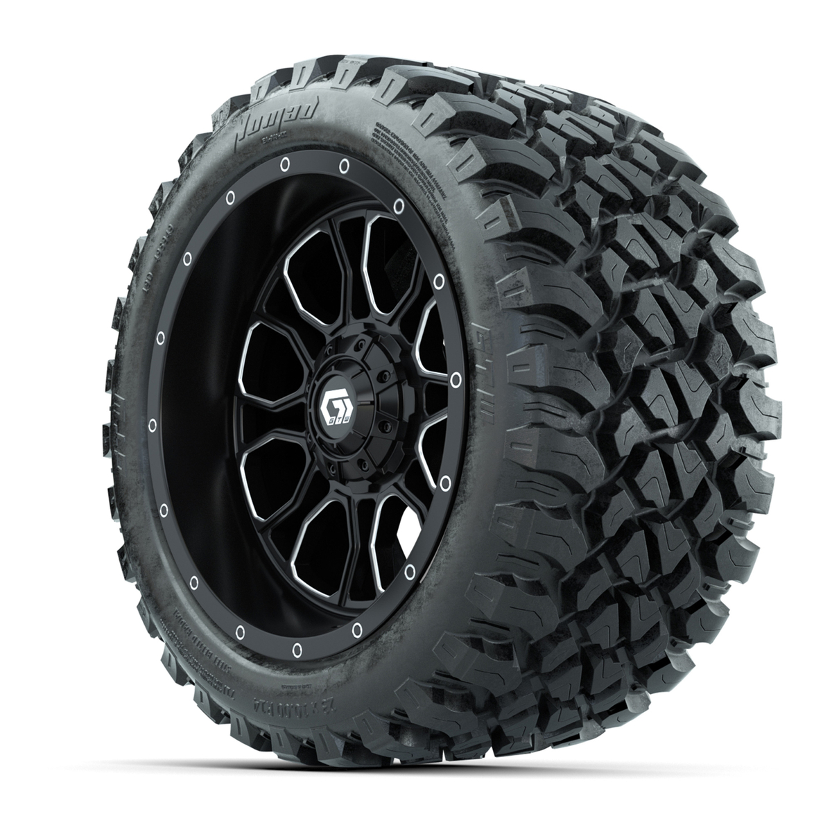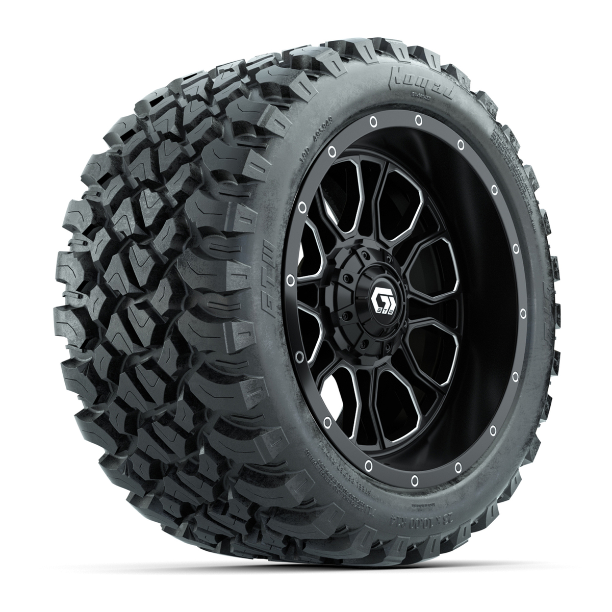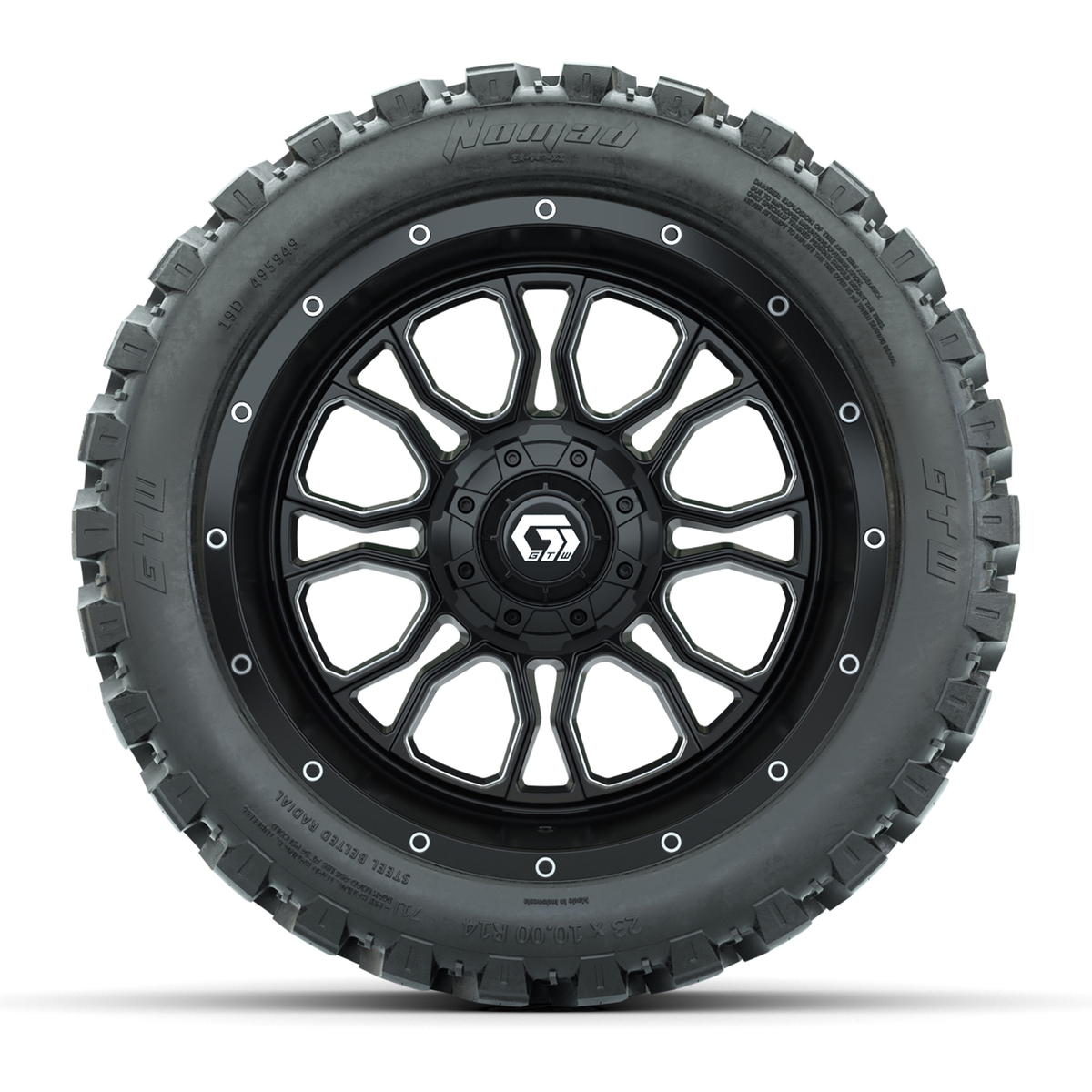 A set of (4) 14-inch GTW® Volt machined face with black golf cart wheels on 23x10-R14 GTW® Nomad All-Terrain Tires