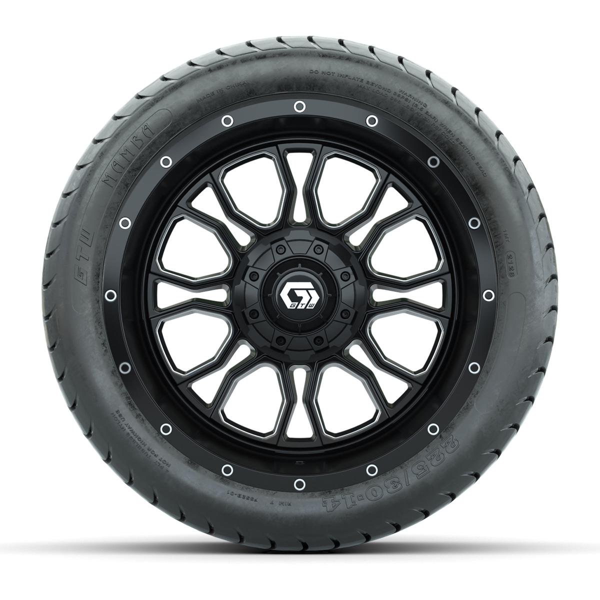 A set of (4) 14-inch GTW® Volt machined face with black golf cart wheels on 225/30-14 GTW® Mamba Street Tires