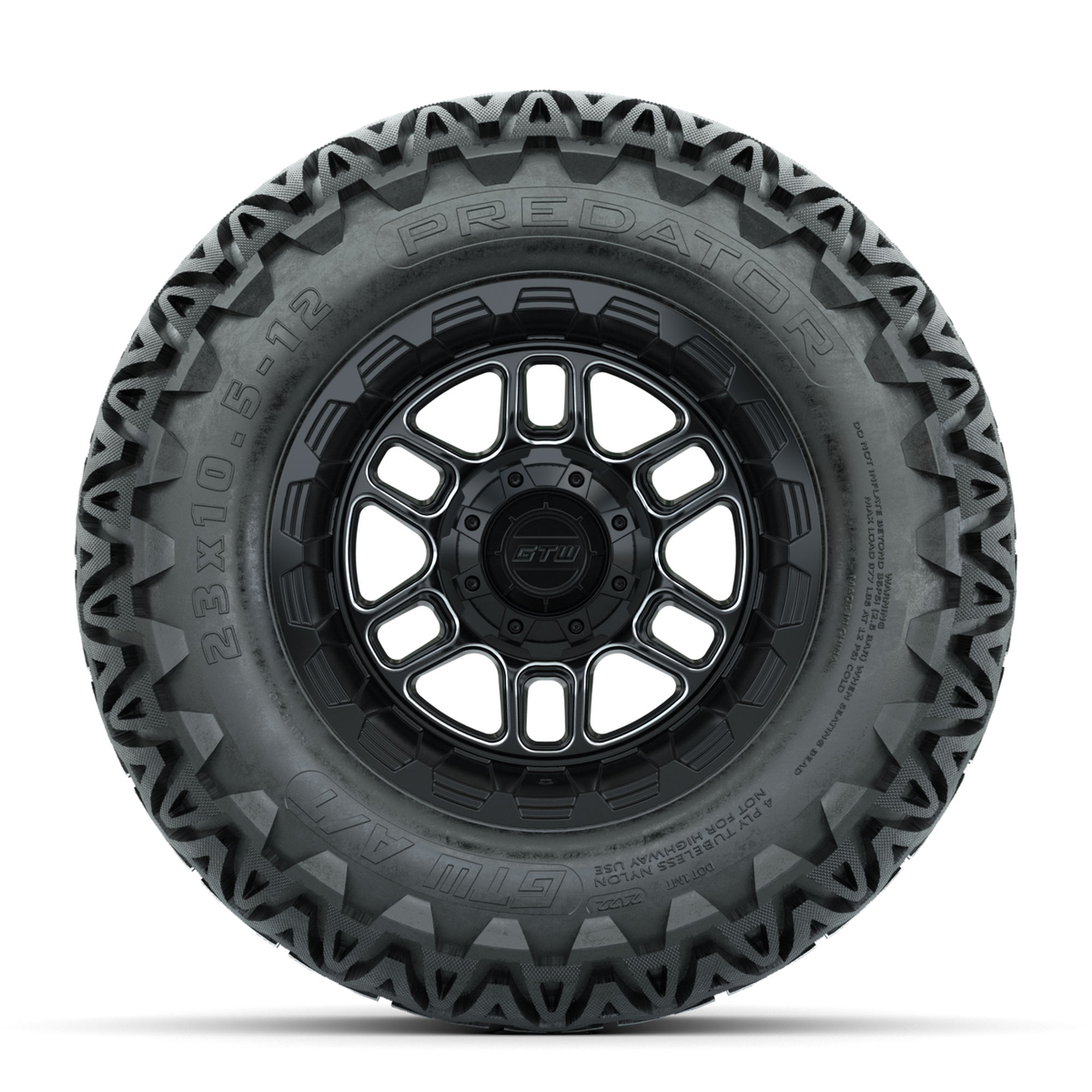 A set of (4) 12-inch GTW® Titan machined face with black golf cart wheels on 23x10.5-12 GTW® Predator All-Terrain Tires