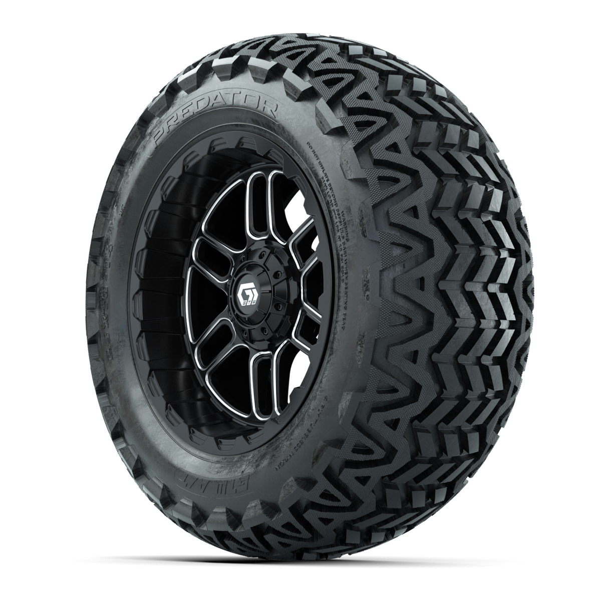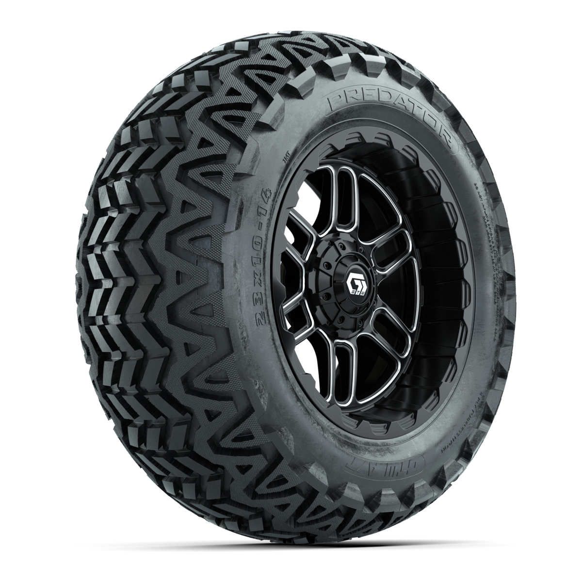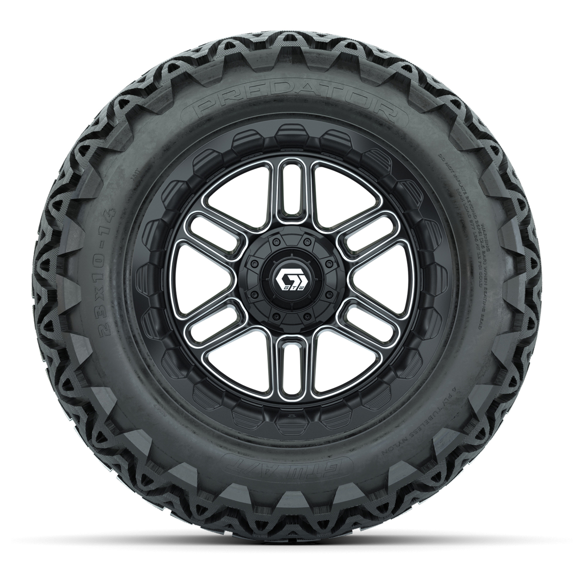 A set of (4) 14-inch GTW® Titan machined face with black golf cart wheels on 23x10-14 GTW® Predator All-Terrain Tires