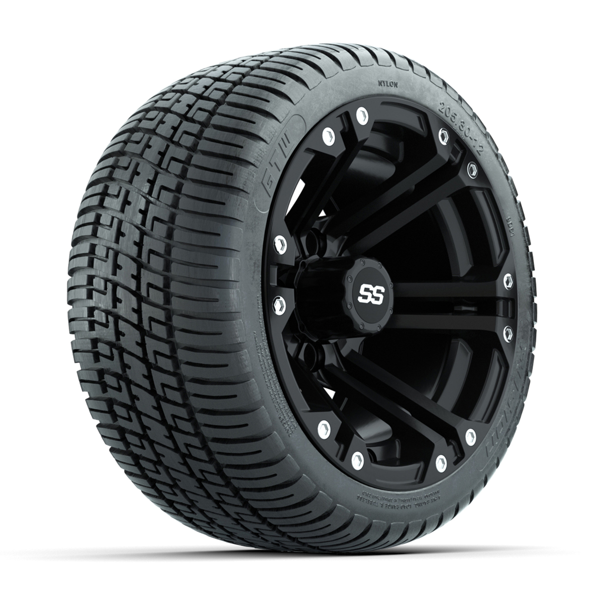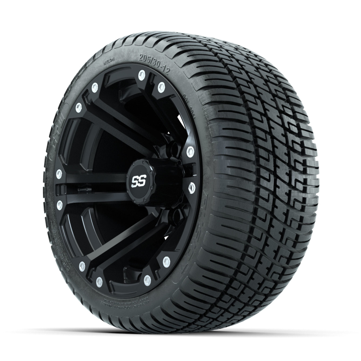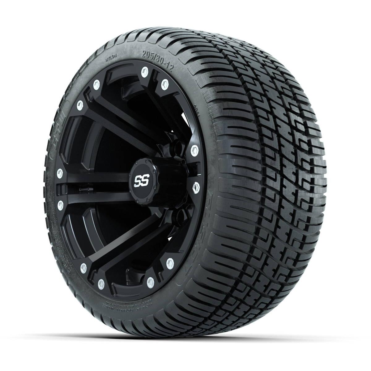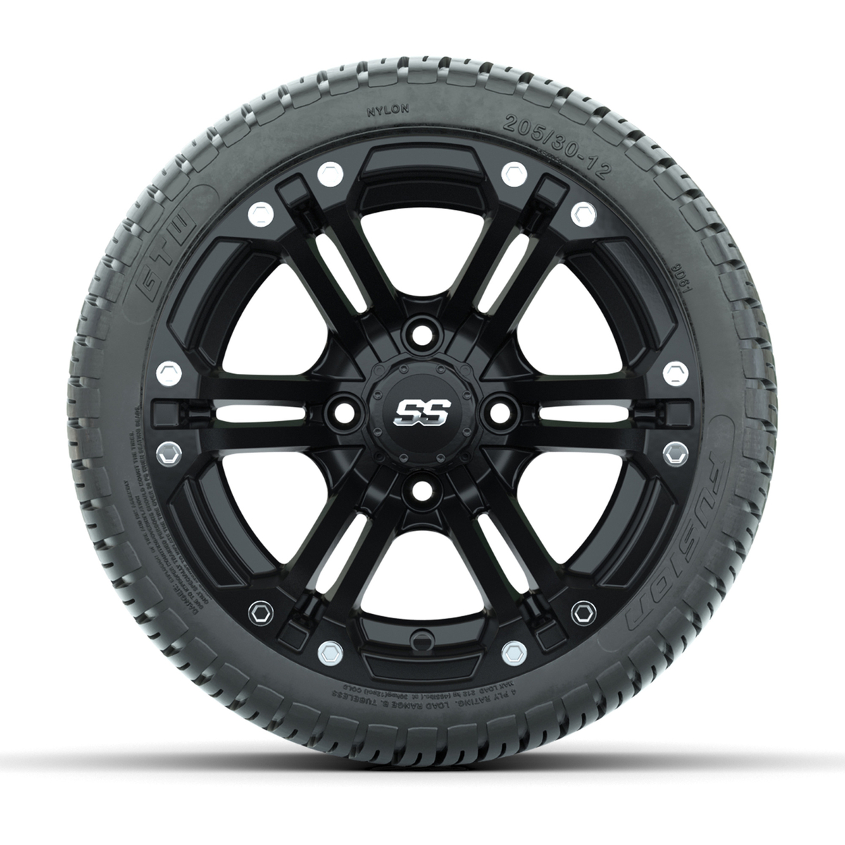 A set of (4) 12-inch GTW® Specter Matte Black golf cart wheels Mounted on 205/30-12 GTW® Fusion Street Tires