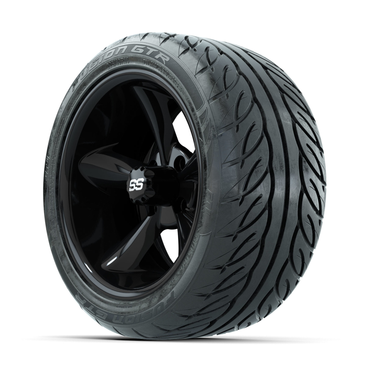 A set of (4) 14-inch GTW® Godfather Black golf cart wheels Mounted on 225/40-R14 GTW® Fusion GTR Steel Belted Street Tires
