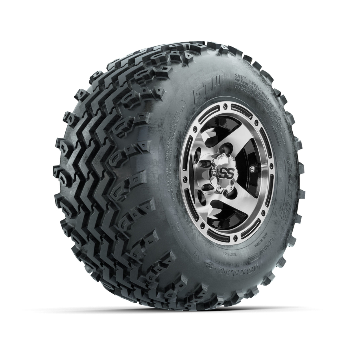 A set of (4) 8-inch GTW® Ranger Machined/Black golf cart wheels Mounted on 18x9.50-8 Rogue All-Terrain Tires