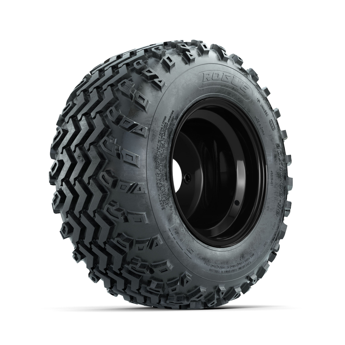 A set of (4) 10-inch GTW® Steel Matte Black 3:5 Offset golf cart wheels Mounted on 20x10.00-10 Rogue All-Terrain Tires