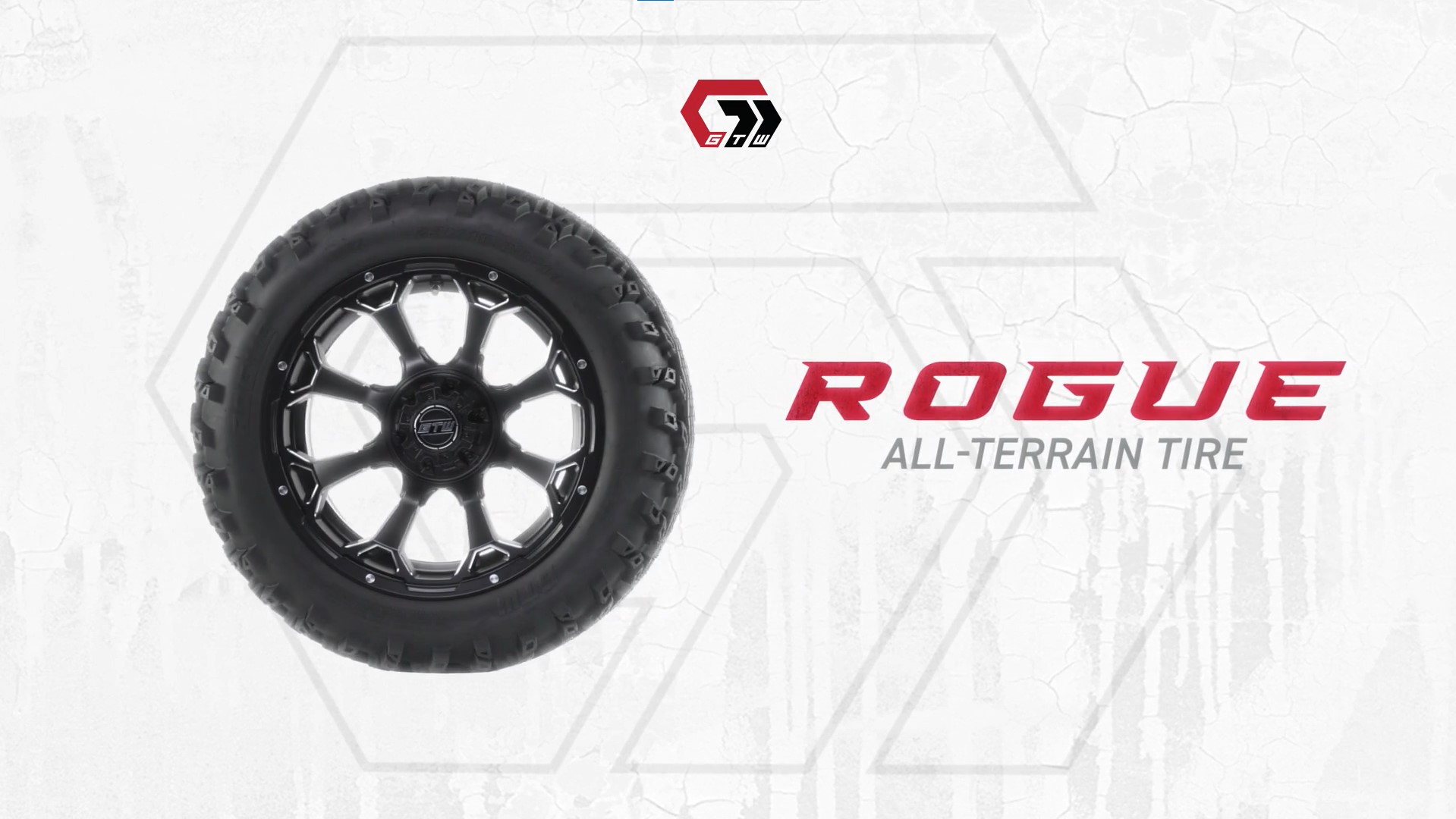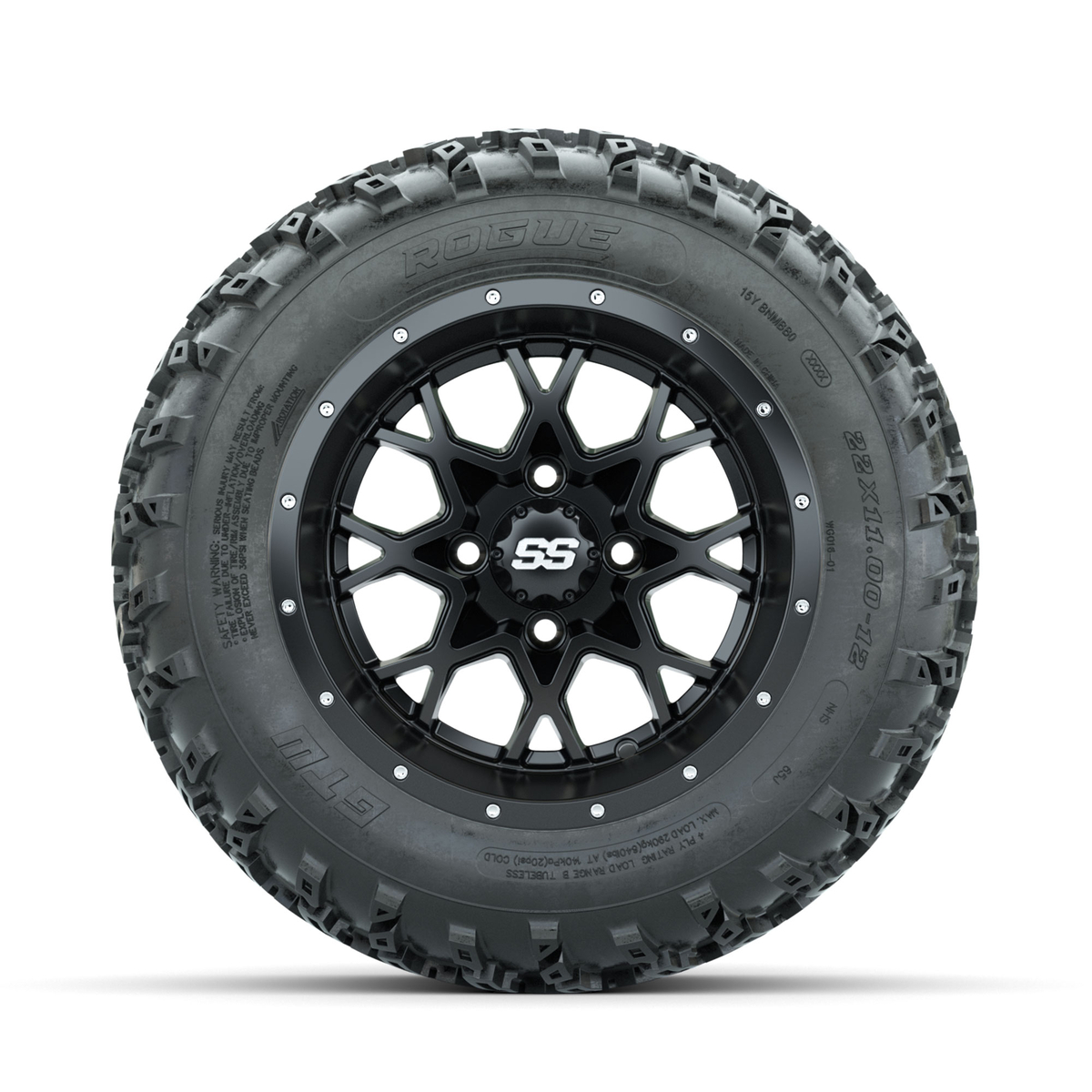 A set of (4) 12-inch GTW® Vortex Matte Black golf cart wheels Mounted on 22x11.00-12 Rogue All-Terrain Tires